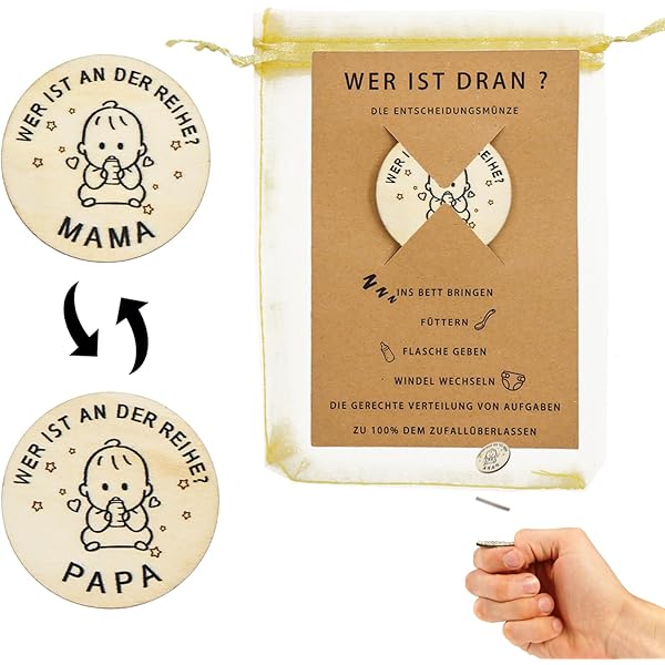 Total lustige Entscheidungsmünze für frischgebackene Eltern! Auf einer Seite 'Mama', auf der anderen 'Papa' - wer wechselt die Windel? Wer macht Fläschchen? Einfach Münze werfen und das Schicksal entscheiden lassen. Aus hochwertigem Edelstahl, rostfrei und langlebig. Kommt in einer schicken Geschenkbox - perfekt verpackt für die Babyparty. Macht das Eltern-Sein fairer und unterhaltsamer. Perfekt als Geschenk zur Geburt, für die Baby-Shower oder einfach so für werdende Eltern. Einfach werfen und lachen - so einfach kann Elternschaft sein!