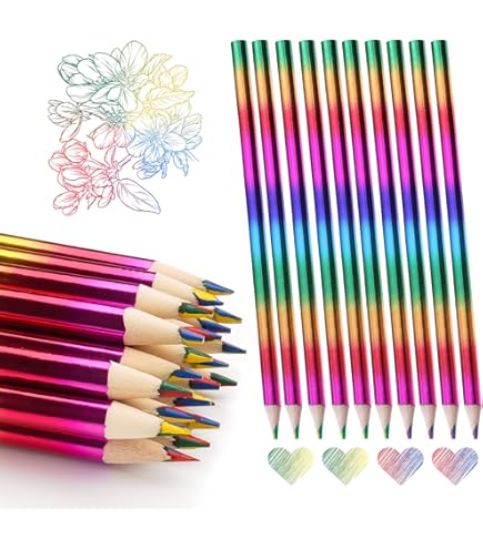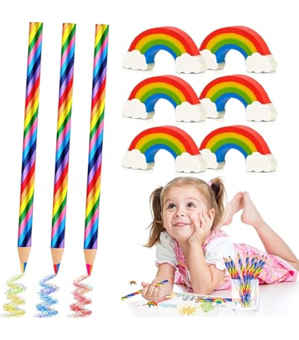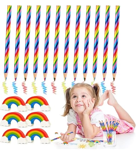 Regenbogen-Farbspaß für kleine Künstler! Dieses super coole Set enthält 20 Regenbogen-Buntstifte und 20 bunte Radiergummis. Jeder Stift hat 4 verschiedene Farben in einem - rot, gelb, grün und blau. So können Kinder ohne Stiftwechsel kunterbunte Bilder malen. Die dreieckige Form liegt perfekt in kleinen Händen und ermüdet nicht. Aus ungiftigem Holz und mit bruchfester Mine - made for kids! Die Radiergummis sind weich und radieren super, ohne das Papier zu beschädigen. Perfekt für Kindergeburtstage, als Mitgebsel, für die Schule oder einfach so. Mit 20 Sets hast du genug für die ganze Klasse oder Geburtstagsgäste. Förder die Kreativität deines Kindes mit diesem fröhlichen Farben-Set!