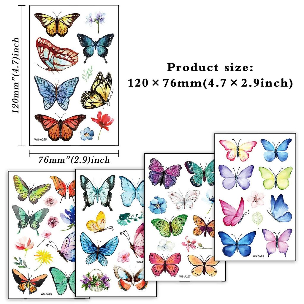 100 bunte Schmetterlings-Tattoos warten darauf, getragen zu werden! Diese temporären Aufkleber sind komplett unschädlich für die Haut und super einfach anzuwenden: Aufkleber nehmen, mit Wasser befeuchten, 10-20 Sekunden warten, Rückpapier abziehen - fertig! Halten 5-15 Tage auf Arm, Gesicht, Hand, Nacken... Perfekt für Pool-Party oder Strand, weil sie wasserfest sind. Mit Alkohol, Babyöl oder Make-up-Entferner leicht zu entfernen. Die handbemalt wirkenden Designs in verschiedenen Stilen begeistern Kinder, Mädchen und Frauen. Toll für Geburtstagsfeiern, Karneval, Halloween oder als Party-Mitgebsel. Maße: 120x76 mm. Mach deine Haut zur Leinwand - ohne schmerzhafte Nadeln!