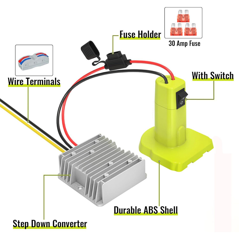 Hey Ryobi-Fans! Dieser Adapter ist ein echter Game-Changer für alle, die ihre 18V Ryobi Akkus vielfältig nutzen wollen. Er wandelt die Spannung von 18V auf 5-13V um - perfekt für alle möglichen DIY-Projekte. Maximal 10A Strom und 130W Leistung sind möglich. Passt auf die meisten Ryobi 18V Lithium-Ionen Akkus wie PBP2005, P194, P108 und viele mehr. Mit Ein/Aus-Knopf und Drehregler für die Spannungseinstellung. Das LED-Display zeigt dir immer die aktuelle Spannung an. Super praktisch: Eingebaute Zigarettenanzünder-Buchse für Auto-Geräte. Mit 16AWG Kabeln und Anschlussklemmen für deine eigenen Projekte. Ob du jetzt LED-Leisten, Motoren, Ventilatoren oder Spielzeug betreiben willst - mit diesem Adapter geht's. Einfach Ryobi-Akku drauf, Spannung einstellen und loslegen. So macht DIY richtig Spaß!