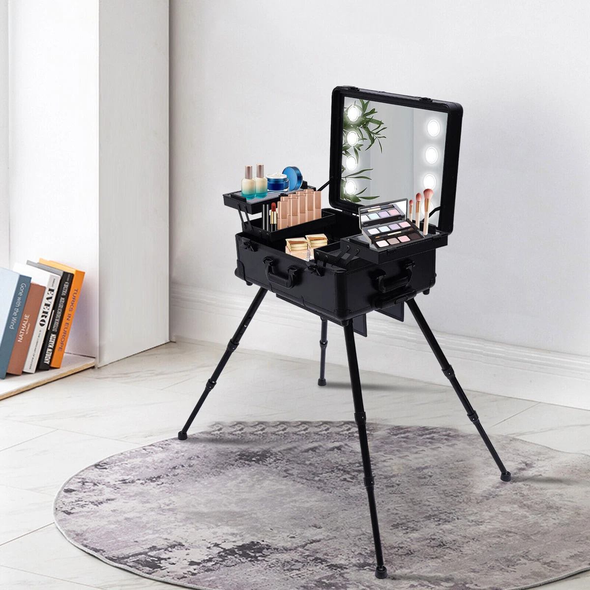 Dieser professionelle Kosmetik-Trolley ist der ultimative Begleiter für alle Beauty-Profis! Mit 4 praktischen Schubladen, die sich super einfach öffnen und schließen lassen. In den Schubladen findest du herausnehmbare Schwämme mit Klammern - perfekt für Nagellack, Pinsel und anderes Zubehör. Oben ein großer Hauptbereich mit Netztaschen für Haartrockner, Lockenwickler oder große Schminkpaletten. Das Beste: Jedes Fach ist abschließbar - deine teuren Utensilien sind sicher verwahrt. Die 360° drehbaren Rollen mit Bremse machen den Transport zum Kinderspiel. Maße: 33 x 26,5 x 80,5 cm (LxBxH), Gewicht 9 kg. Ideal für Friseure, Make-up-Artists, Nageldesigner oder Tätowierer. Die untere Schublade hat einen klappbaren Bügel für extra Stabilität. In dunkelgrün sieht er richtig professionell aus. Endlich alles ordentlich an einem Platz - ob im Salon oder auf Reisen zu Kunden!