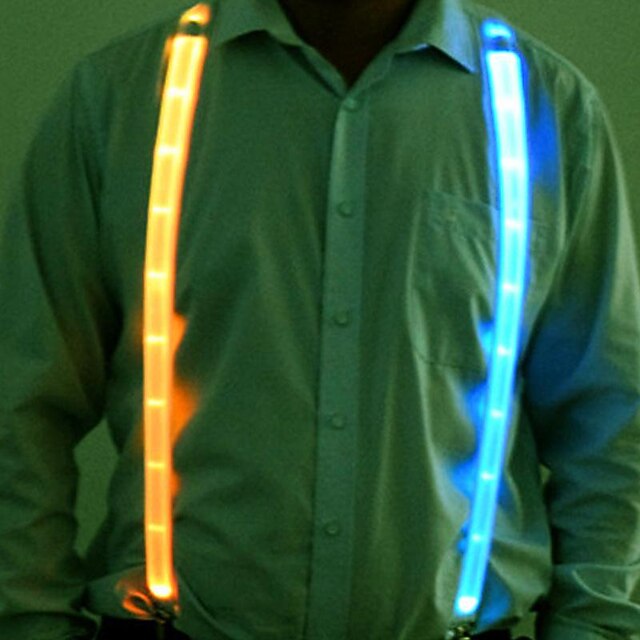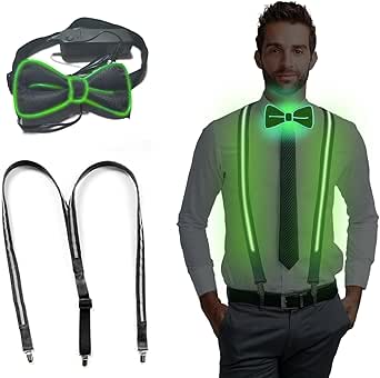 Werde zum absoluten Party-Highlight mit diesem verrückten LED Hosenträger Set! Das 3-teilige Set in Grün (auch in Rot und Blau erhältlich) besteht aus leuchtenden Hosenträgern, einer coolen LED-Fliege und einer abgefahrenen LED-Brille. Drei Beleuchtungsmodi stehen zur Auswahl: Dauerlicht, langsames Blinken und schnelles Blinken - einfach per Knopfdruck umschalten! Aus hochwertigem Polyester gefertigt, ist das Licht angenehm weich und nicht grell. Die Hosenträger sind 110cm lang und verstellbar, passen also für die meisten Erwachsenen (170-180cm). Einfache Bedienung: Ein/Ausschalter mit Clip für Gürtel oder Tasche. Für Fliege und Brille werden je 2 AA Batterien benötigt (nicht im Lieferumfang). Perfekt für Karneval, Musikfestivals, Partys, Halloween oder Silvester - du wirst garantiert zum Mittelpunkt! Aber nicht nur für Partys: Auch als Sicherheitsbeleuchtung bei Nachtläufen oder Wanderungen super geeignet. Mach die Nacht zum Tag und bestell jetzt dieses verrückte Leucht-Set!