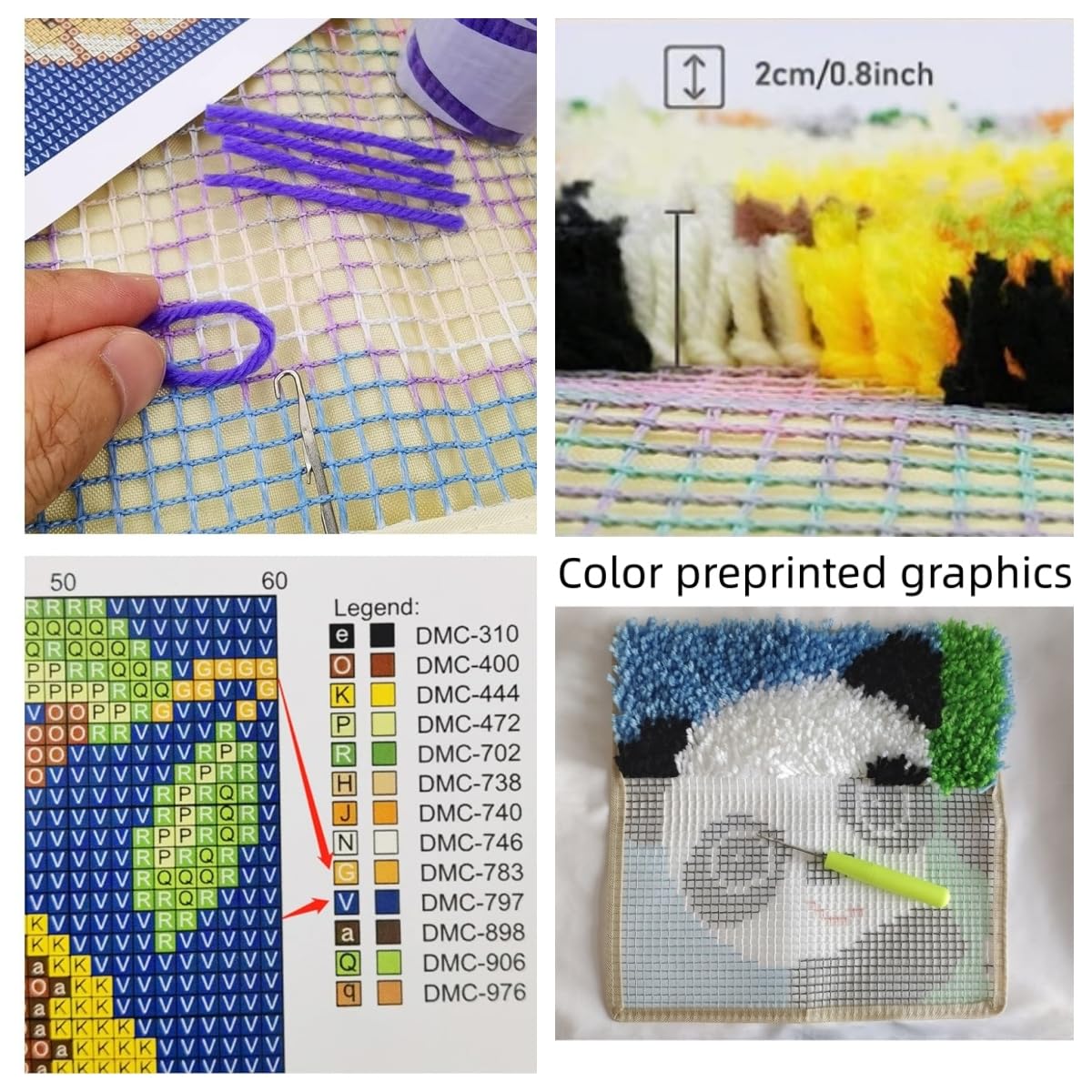 Das Gitter hat das Muster schon drauf, du siehst also genau, welche Farbe wohin kommt. Einfach die Schlaufen machen, einhaken, ziehen – und nach und nach entsteht ein wunderschöner, flauschiger Teppich. Perfekt als Bodenläufer, Badezimmerteppich, Sofadeko oder sogar als Wandbehang.