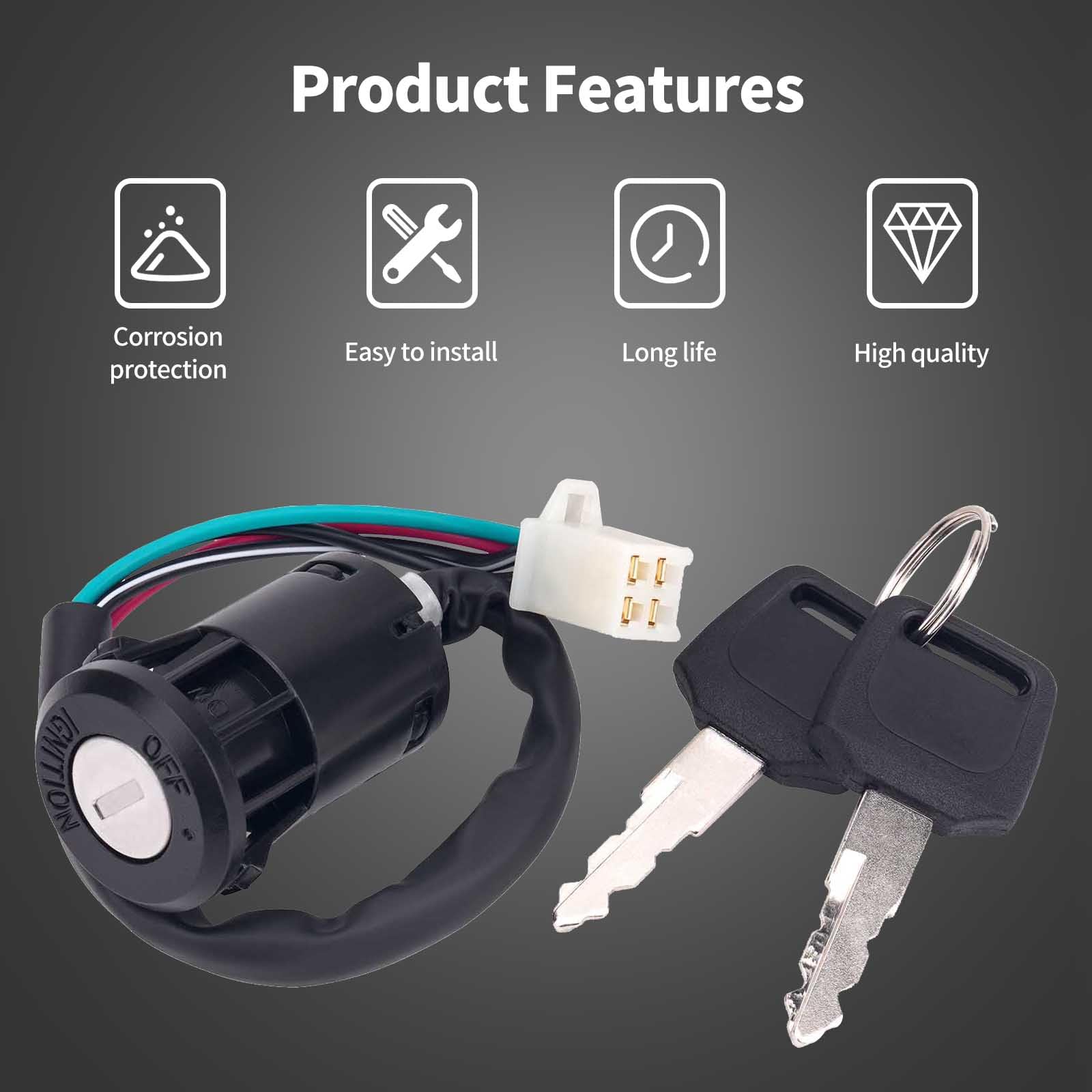Hey, suchst du ein neues Zündschloss für deinen Quad oder Motorrad? Dieses Universal-Teil passt für echt viele Modelle! Ob TaoTao, Buyang, Kazuma oder Sunl - wenn deine Maschine zwischen 50cc und 250cc hat, wird das passen. Ist ja auch kein Wunder, das Teil hat 4 Drähte und ist einfach einzubauen. Einfach das alte raus, das neue rein - stecken, fertig! Kein Rumgefummel mit Kabeln nötig. Das Gehäuse ist aus robustem ABS, die Kontakte aus Messing. So rostet nix und die Stromleitung ist top. In der Lieferung sind gleich 2 Schlüssel dabei, falls mal einer abhanden kommt. Perfekt für: ATVs, Quads, Motorroller, Mopeds, Dirt Bikes, Pocket Bikes... einfach alles, was mit Benzin fährt und aus China kommt. Die Positionen sind übrigens ON und OFF - mehr braucht man ja auch nicht. Wenn dein altes Zündschloss schlapp macht oder du Ersatzschlüssel willst, bist du hier goldrichtig!