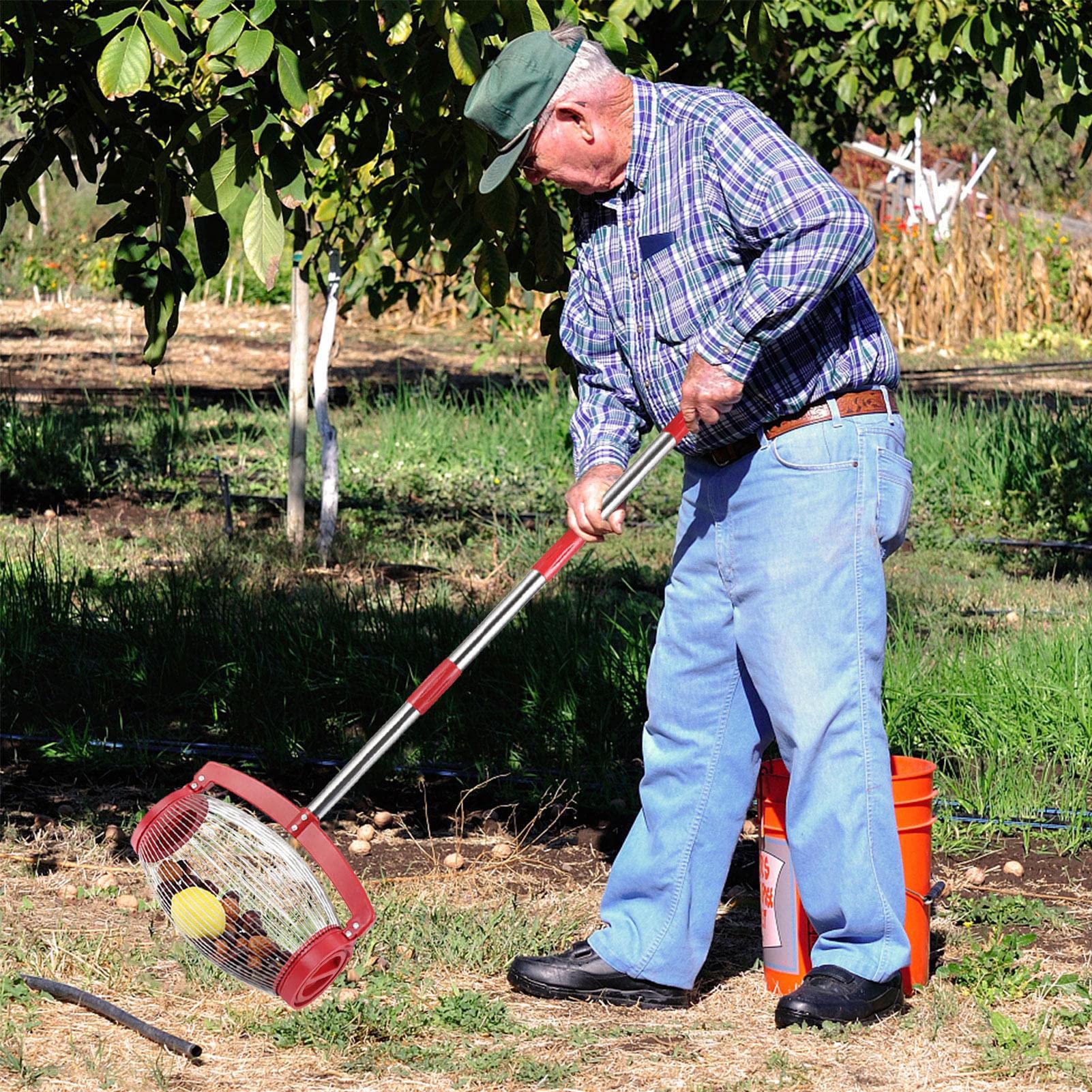 Nie wieder mühsam Nüsse und Früchte aufsammeln! Dieser praktische Nusspicker mit teleskopierbarem Griff (47-150cm) macht die Gartenarbeit zum Kinderspiel. Einfach über den Boden rollen und der Drahtkäfig sammelt Walnüsse, Kastanien, Eicheln oder Tannenzapfen ohne Bücken. Der verstellbare Griff passt sich deiner Körpergröße an - schonend für den Rücken! Das handbetriebene Gerät benötigt keine Batterien. Zum Entleeren einfach die Drähte auseinanderziehen. Ein unverzichtbares Werkzeug für Gartenbesitzer, Obstbauern und alle, die im Herbst viel im Garten arbeiten. Mach dir die Ernte leicht mit diesem cleveren Helfer!