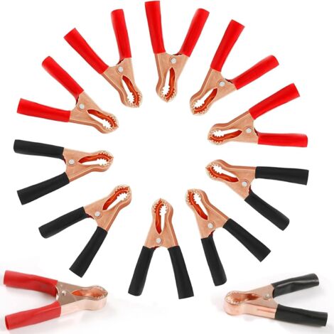 Professionelle Klemmen für alle Elektro-Projekte! Dieses 12-teilige Set mit 6 roten und 6 schwarzen Krokodilklemmen ist perfekt für Autobatterien, Starthilfekabel oder Elektro-Arbeiten. Aus reinem Kupfer mit Messing-Beschichtung für beste Leitfähigkeit. Mit Isolier-Gummimantel für sichere Handhabung. Nennstrom 50A, Gesamtlänge 80mm. Die gezahnten Greifer halten Kabel sicher fest, ohne zu verrutschen. Einfach zu öffnen und zu schließen. Ideal für Heimwerker, Hobby-Elektriker oder Werkstätten. Farbkodierung hilft bei Plus/Minus-Unterscheidung. Perfekt für Reparaturen, Tests oder Ladegeräte. Hochwertige Verarbeitung für lange Haltbarkeit.