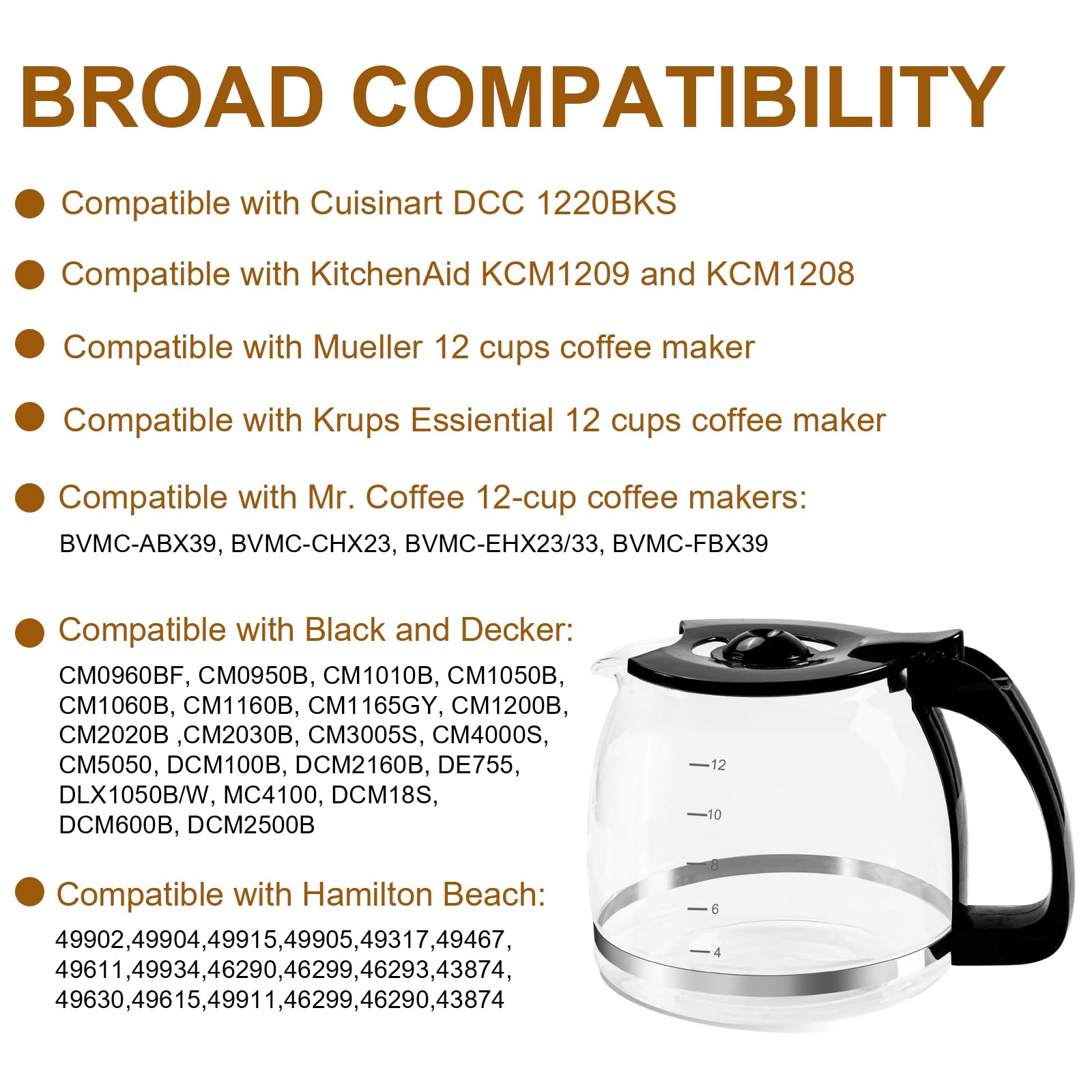 Deine Kaffeekanne kaputt? Kein Problem! Diese Glaskaraffe passt als Ersatz für Mr Coffee, Black & Decker, Hamilton Beach, KitchenAid und viele andere 12-Tassen-Kaffeemaschinen. Mit 1,8 Liter Fassungsvermögen und klaren Messmarkierungen für 4-12 Tassen. Aus hochwertigem Borosilikatglas - hitzebeständig von -20°C bis 150°C. Der besondere Clou: Drei verschiedene Schnappkappen sind dabei, damit die Karaffe sicher und stabil auf deiner Maschine sitzt. Der ergonomische Griff liegt super in der Hand und das präzisionsgefertigte Glas sorgt für optimale Wärmespeicherung. Der abnehmbare Deckel macht die Reinigung super einfach - einfach in die Spülmaschine oder von Hand waschen. Kompatibel mit Mr Coffee Modellen wie BVMC-ABX39, BVMC-CHX23 und vielen mehr. Endlich wieder perfekten Kaffee genießen - ohne teure Original-Ersatzteile!