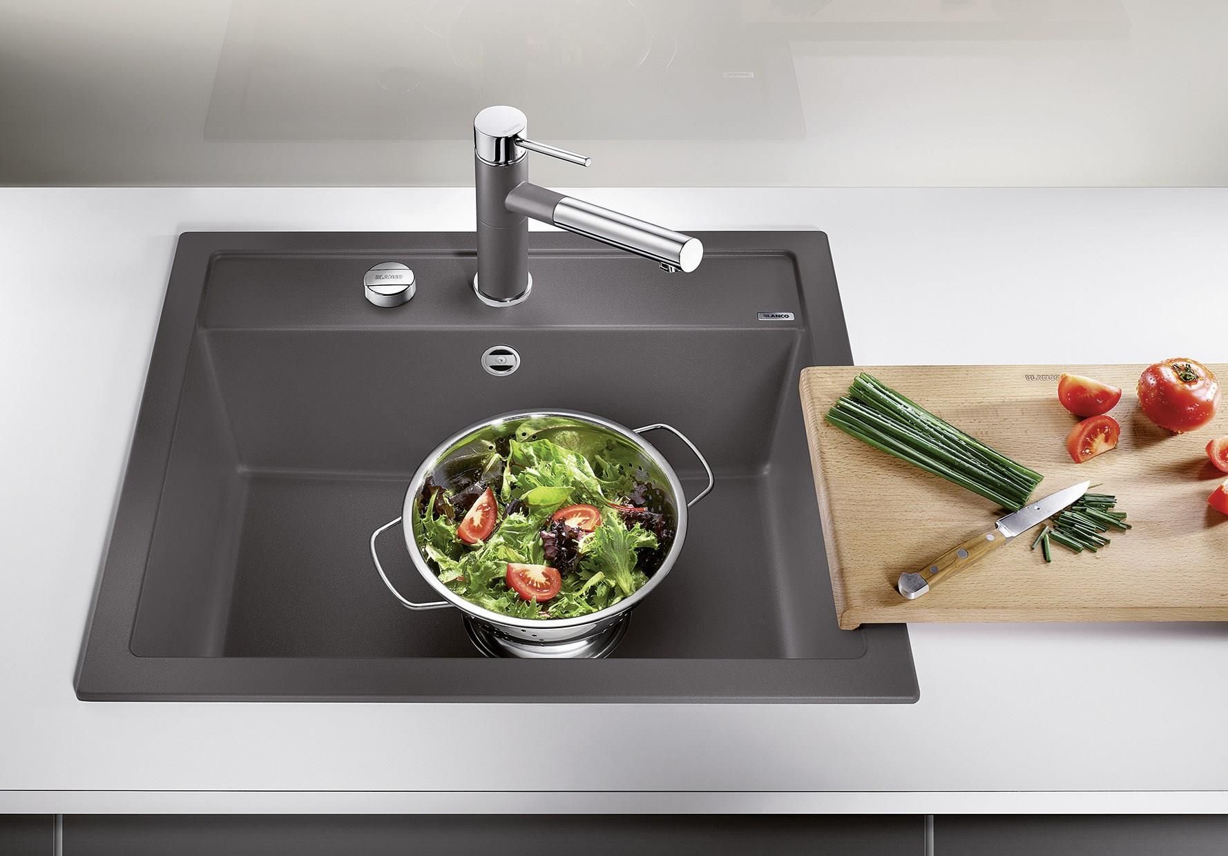 Die BLANCO DALAGO 6 Granitspüle ist ein echter Traum für jede Küche! Aus hochwertigem SILGRANIT gefertigt - das ist ein patentiertes Material mit 80% Quarzanteil. Extrem kratzfest, hitzeunempfindlich und super pflegeleicht. Perfekt für 60 cm breite Unterschränke, aber mit überraschend großem Beckenvolumen. So hast du auch bei sperrigem Geschirr genug Platz. Die Spüle wird von oben eingebaut und sieht einfach edel aus in schwarz. Mit integriertem Überlauf und praktischer Ablaufgarnitur inklusive. Das zeitgemäße Design mit klaren Linien und angenehmer Stein-Haptik macht jede Küche zum Eyecatcher. Optionales Zubehör wie Abtropfflächen oder Schneidbretter passen perfekt dazu. Ein Qualitätsprodukt das lange hält und deine Küchenarbeit erheblich erleichtert!
