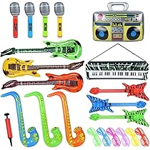 Wow, was für ein mega Party-Set! Das Kinmsito Pack mit 17 Teilen bringt Stimmung in jede Feier - egal ob Kindergeburtstag, Musikfestival oder Karneval. Enthalten sind 4 bunte Gitarren (93cm lang), 4 Saxophone (70cm) und 4 Mikrofone in kunterbunten Farben, plus 4 coole Shutter-Shading-Brillen und eine praktische Handluftpumpe.