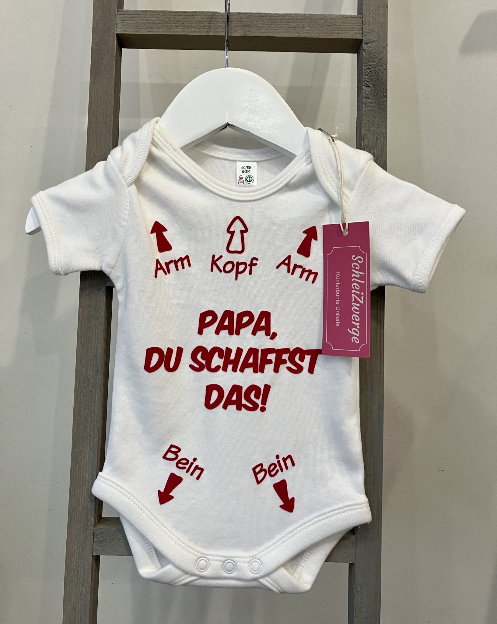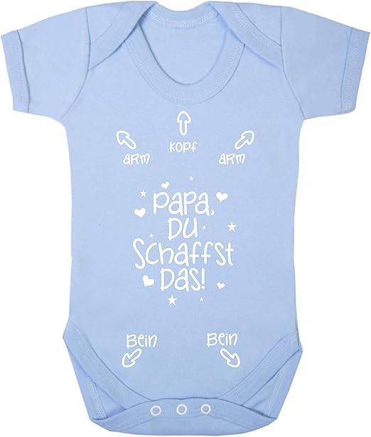 Oh, dieser Babybody ist ja mal total süß! Mit dem Motiv \Papa Du Schaffst Das\ ist er das perfekte Geschenk für werdende Väter. Aus 100% Bio-Baumwolle, super weich und atmungsaktiv - einfach ideal für zarte Babyhaut. Der 200g/m² Interlock-Stoff ist richtig strapazierfähig und der Schlupfkragen mit den Druckknöpfen macht das An- und Ausziehen super einfach. Hergestellt und bedruckt in Deutschland - da stimmt einfach die Qualität! Verfügbar in Größen von 0-3 Monaten bis 18-24 Monaten. Perfekt für Babypartys, Babyshower, Gender Reveal oder einfach als nette Überraschung für den werdenden Papa. Auch toll zur Geburt, Taufe oder zum ersten Geburtstag. Einfach waschen bei 30-40°C auf links - und schon ist er wieder frisch. Dehnbar und bequem - dein Baby kann strampeln, krabbeln und spielen ohne eingeschränkt zu werden. Ein richtig schönes, persönliches Geschenk das garantiert Emotionen weckt!
