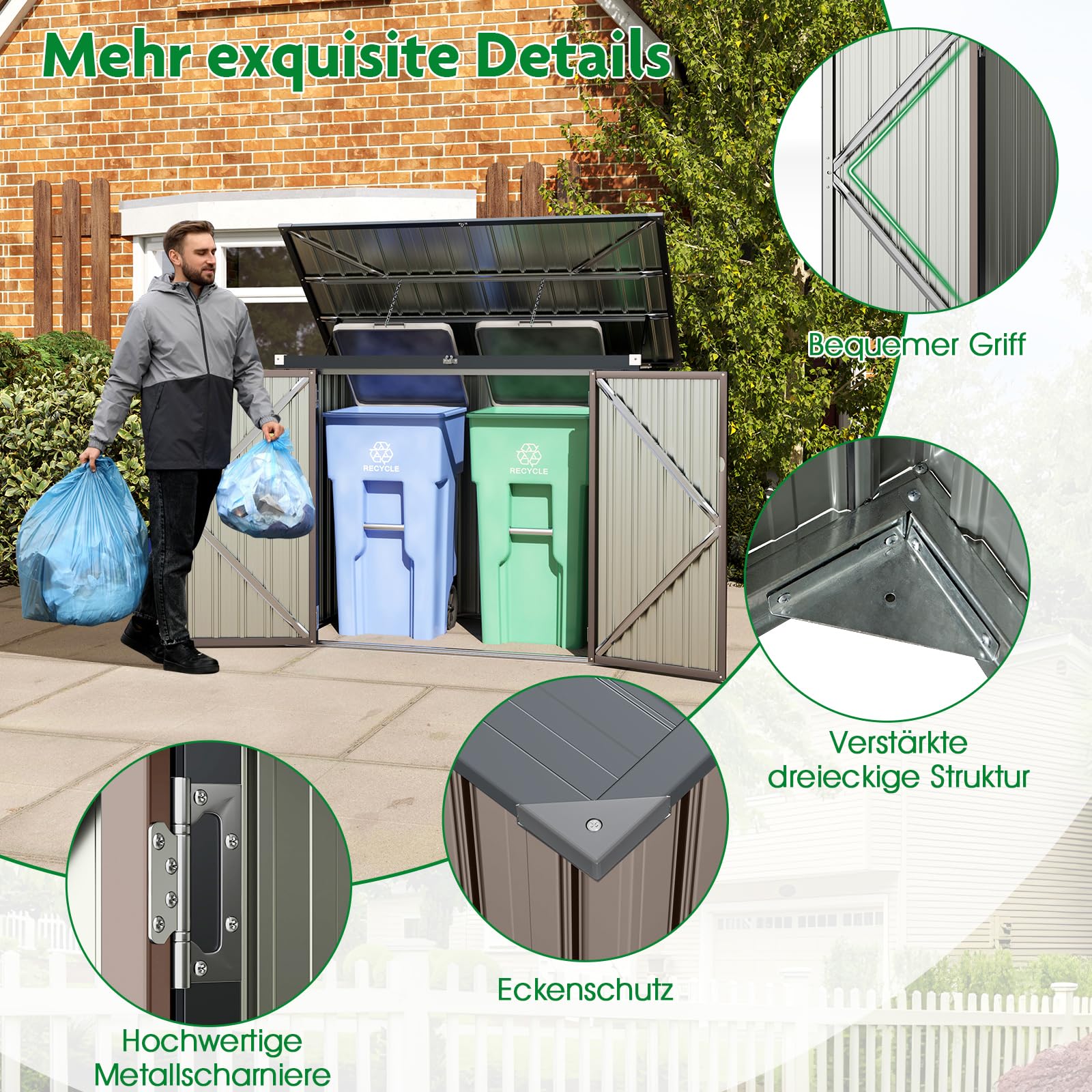 Puh, Mülltonnen sind ja echt nicht die schönsten Deko-Objekte im Garten, oder? Mit dieser COSTWAY Mülltonnenbox versteckst du die Dinger endlich diskret! Die Box ist riesig: 193 x 86 x 127 cm - da passen locker zwei 120-Liter-Tonnen rein. Aus verzinktem Stahl mit Farbbeschichtung - hält jedem Wetter stand und rostet nicht so schnell. Das absolut Geniale: Die Tür ist abschließbar! Keiner klaut mehr deine Mülltonnen oder wirft wild Müll rein. Das Dach kann man öffnen - super praktisch, wenn man mal schnell was reinwerfen will. Mit 1,9 m³ Stauraum passt da nicht nur Müll rein, sondern auch Gartenmöbel, Fahrräder oder Werkzeug. Montage ist simpler als gedacht - Schnellverschlusssystem spart Zeit und Nerven. Für extra Stabilität kannst du sie auf Beton oder Holz verschrauben (Befestigungsset für Beton inklusive). Endlich Ordnung im Garten - und das zu einem fairen Preis! Deine Nachbarn werden neidisch sein, versprochen!