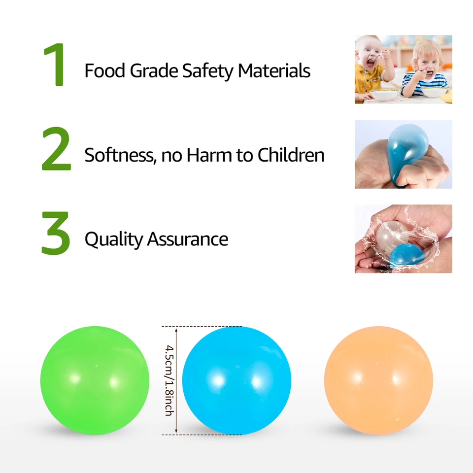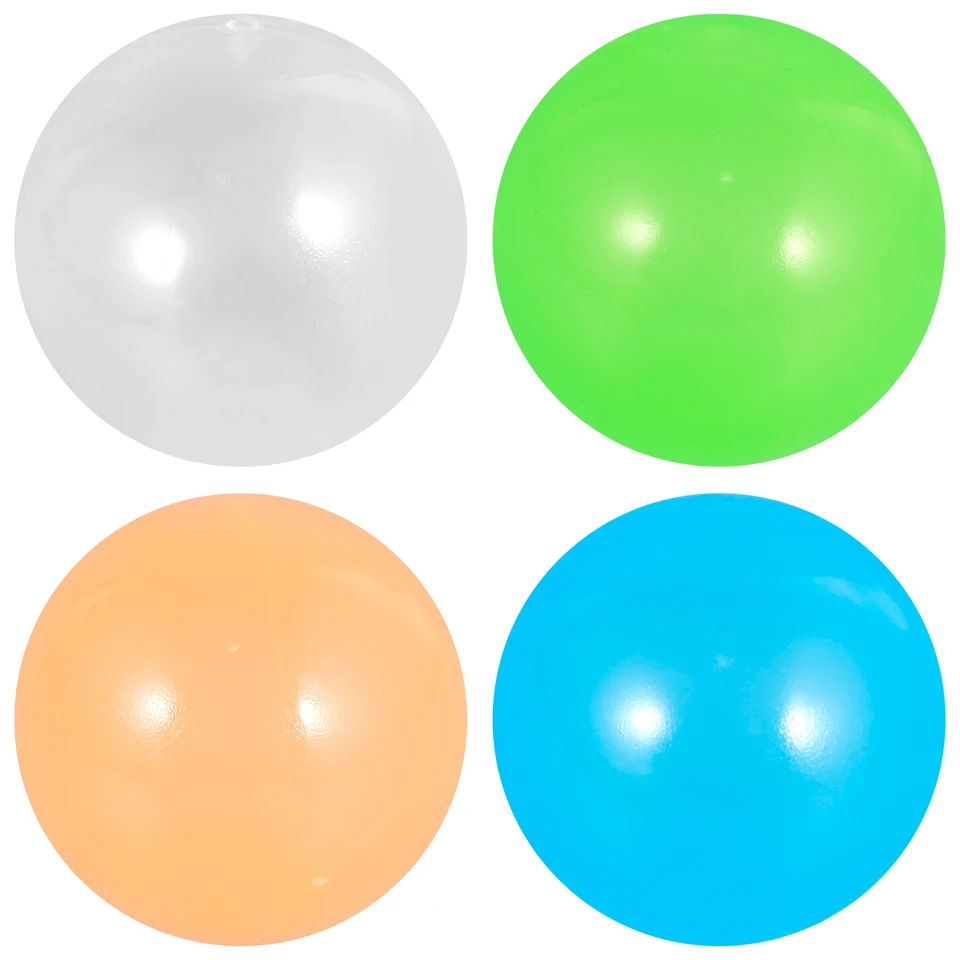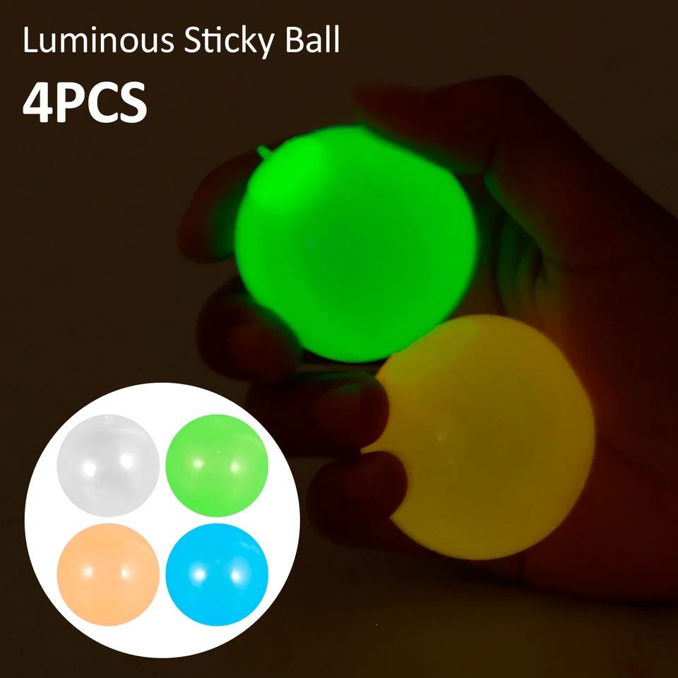 Verwandele dein Zimmer in einen magischen Spielplatz! Diese selbstklebenden Bälle haften an Decken und Wänden und leuchten im Dunkeln nachdem sie im Licht aufgeladen wurden. Einfach anwerfen, kleben lassen und staunen! \\n\\nSuper elastisch - kehren immer in ihre ursprüngliche Form zurück. Perfekt zum Stressabbau: Ob kneten, werfen oder ziehen - diese Bälle halten alles aus. \\n\\nNicht nur Spielzeug: Die starke Haftung macht sie auch praktisch zum Aufsammeln von Schmutz und Haaren. Vielseitig einsetzbar im Haushalt! \\n\\nIdeal für Kinderzimmer, Partys oder als Büro-Stressball. Mit 4 glänzenden Bällen im Set - genug für die ganze Familie. Bring Action in deine vier Wände und entdecke die kreativen Möglichkeiten!