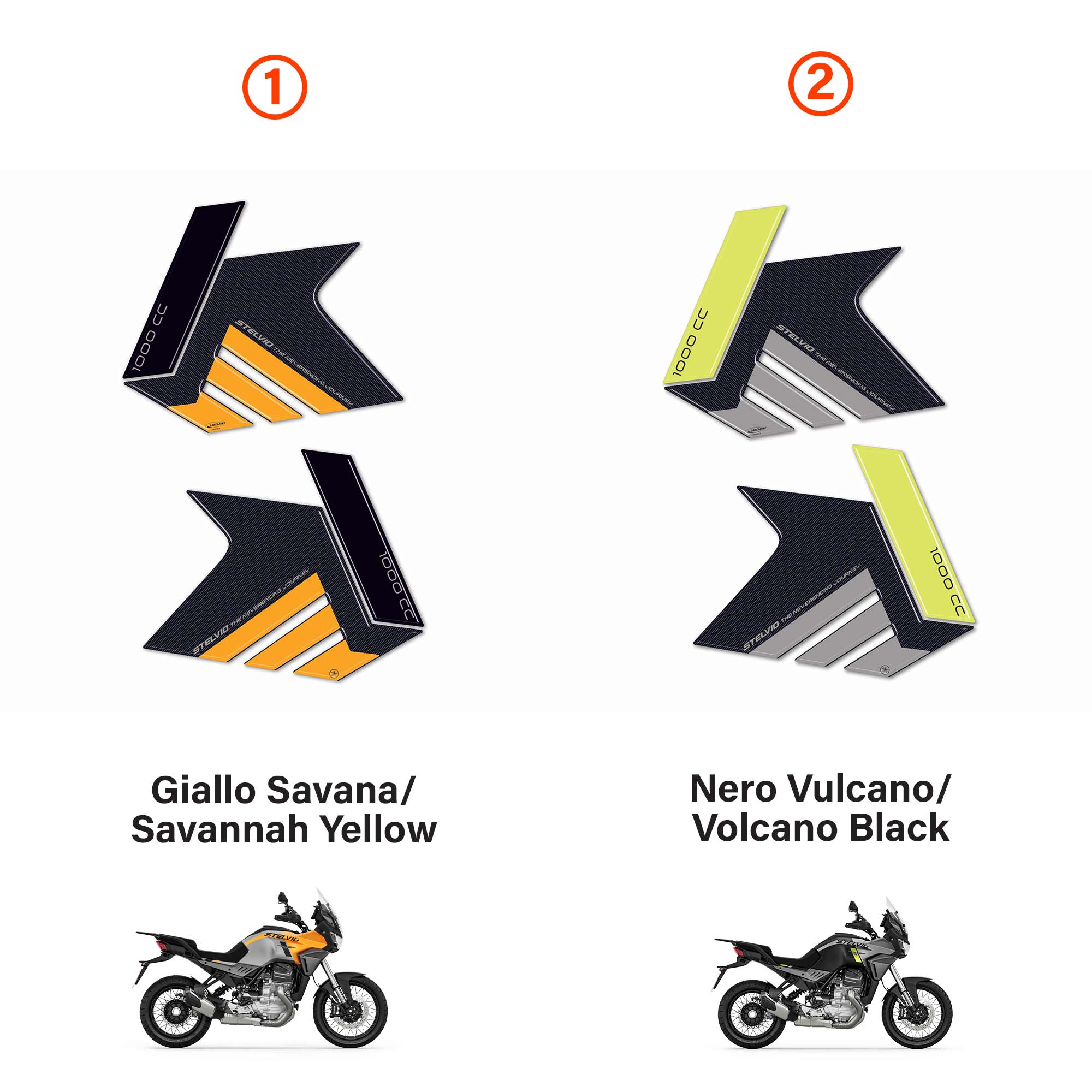 Willst du deine Guzzi Stelvio individualisieren und gleichzeitig schützen? Diese handgefertigten 3D-Aufkleber von labelbike sind genau das Richtige! Speziell für das Modell ab 2024 designed, haften sie perfekt auf den Einstiegsleisten. Die harzbeschichtete Oberfläche schützt vor Kratzern, Witterung und sogar vor Stürzen. Hergestellt in Italien mit Liebe zum Detail. Einfach anbringen - die betroffene Stelle vorher gut reinigen, Aufkleber aufbringen und dein Bike bekommt sofort einen individuellen Look. Wasserdicht, kratzfest und frostbeständig bis -20°C. Mach deine Guzzi einzigartig, ohne sie zu ruinieren!