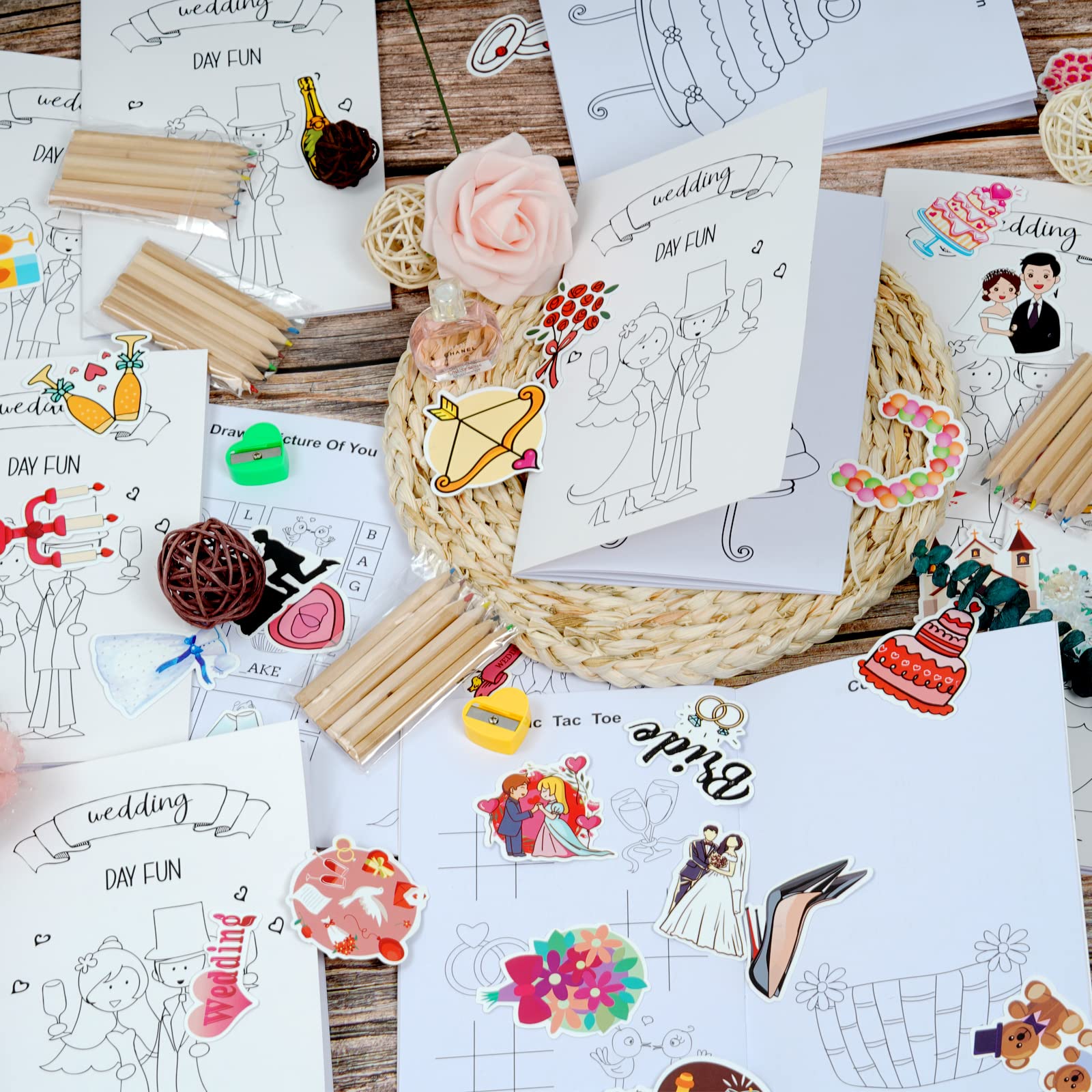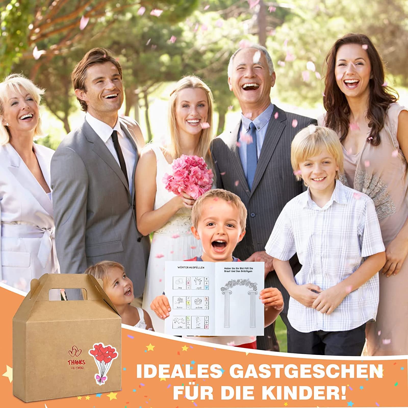 Oh, wie süß ist denn dieses Hochzeits-Malbuch Set! Perfekt damit die kleinen Gäste auf der Hochzeit nicht langweilig wird! Im Set sind 10 Malbücher, 10 Sets Buntstifte, 50 coole Aufkleber und sogar 2 herzförmige Spitzer dabei - alles in einer schicken Geschenkbox! Die Malbücher haben total vielfältige Motive: Bilderrätsel, Labyrinthe, Zahlen- und Wortspiele - alles rund ums Hochzeitsthema! So können sich die Kids kreativ austoben während die Erwachsenen feiern! Das Papier ist hochwertig und reißt nicht so leicht, die Stifte sind glatt und ohne scharfe Kanten! Ab 3 Jahren geeignet - also für fast alle Kids perfekt! Auch super als Gastgeschenk oder für die Hochzeitstisch-Dekoration! Damit wird die Hochzeit für die Kleinen genauso unvergesslich wie für die Großen! Einfach auspacken und die Kinder sind stundenlang beschäftigt!