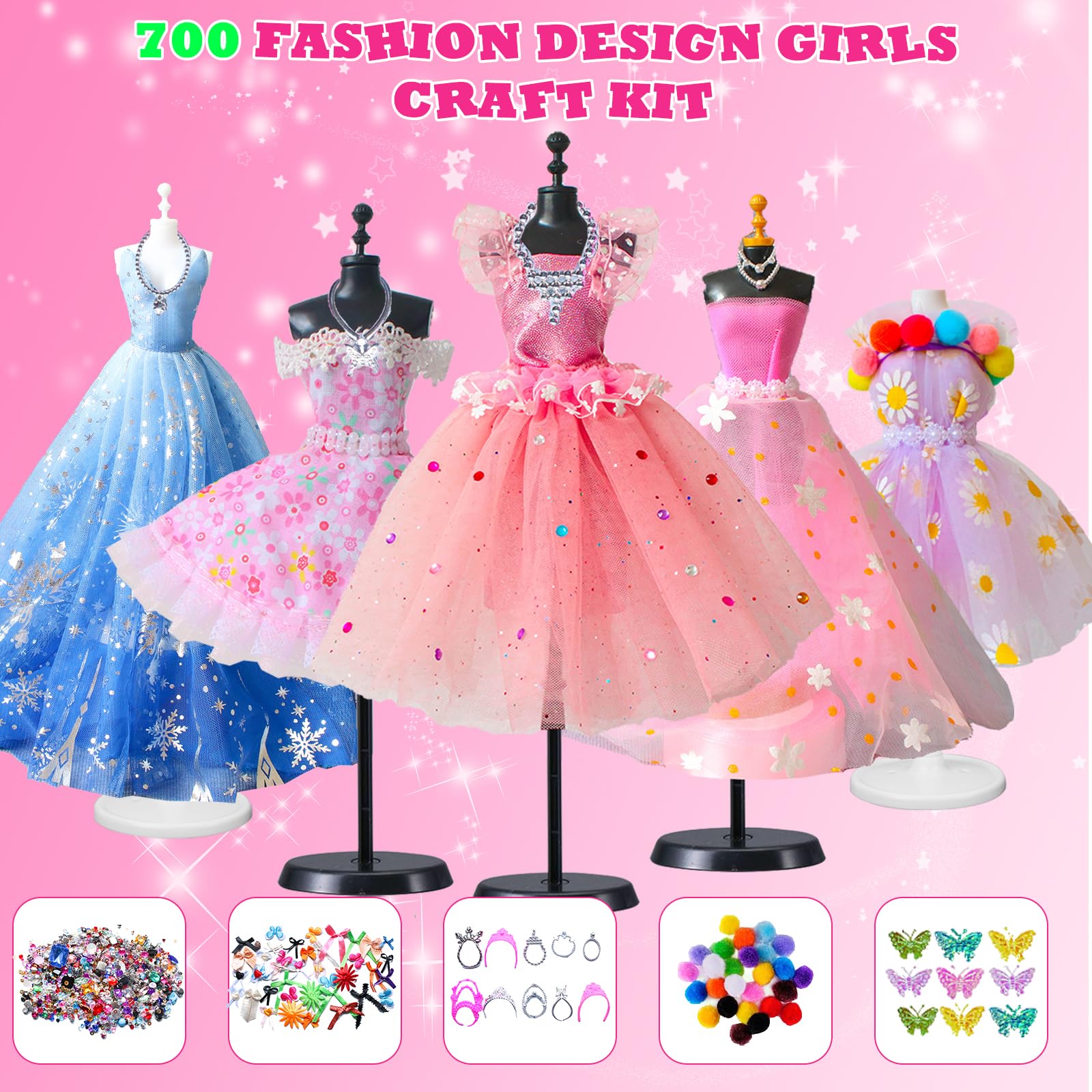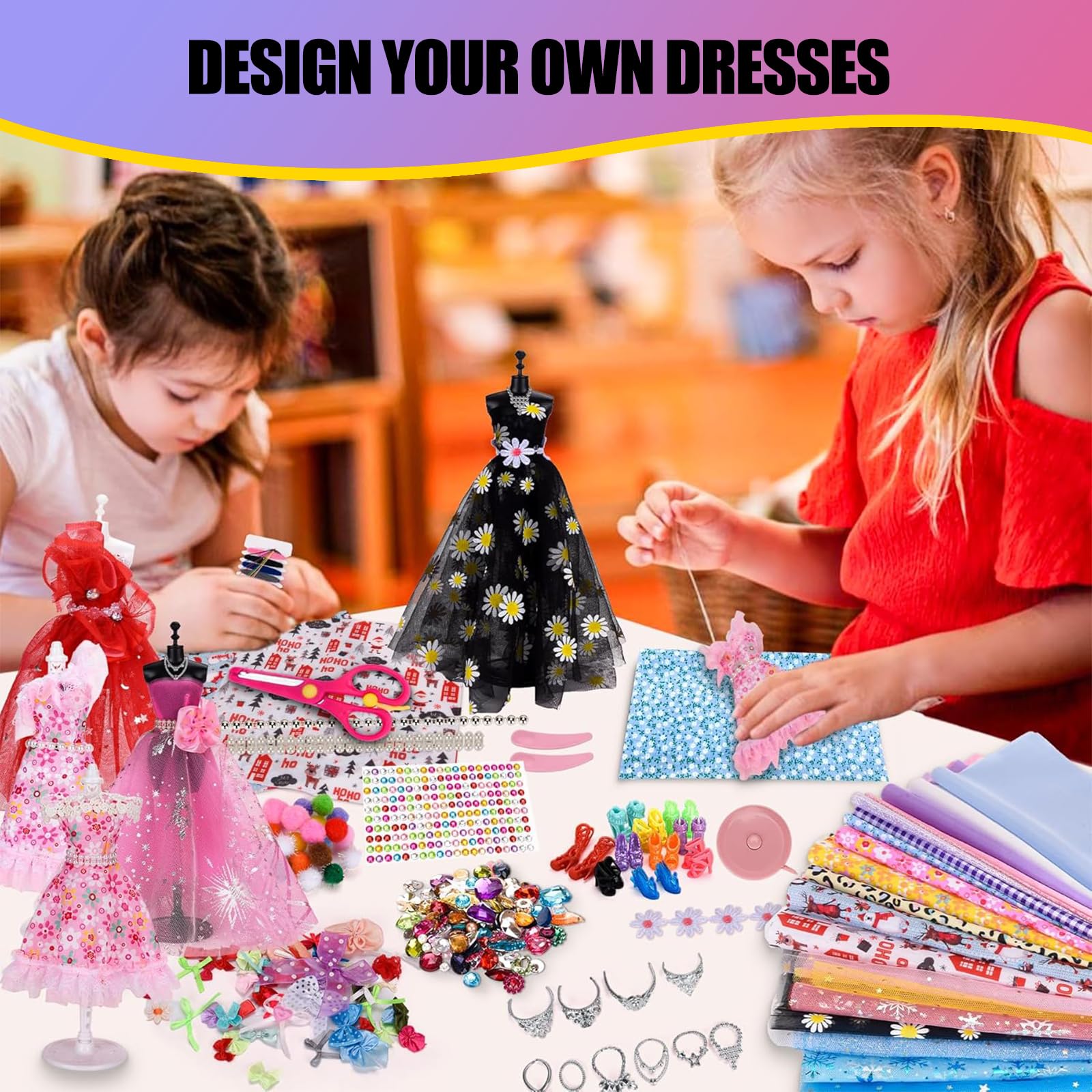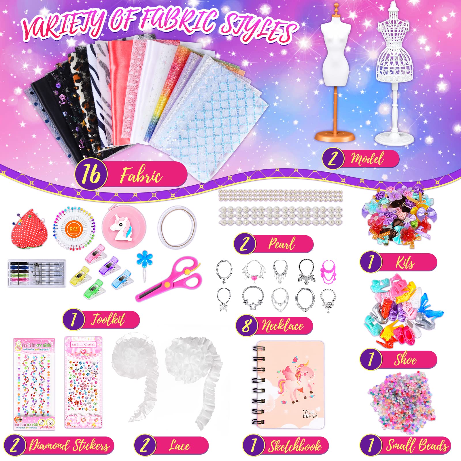 Wow, hier können kleine Modedesigner richtig loslegen! Dieses vollständige Set verwandelt Mädchen ab 6 Jahren in echte Fashion-Designer. Mit zwei verschiedenen Schaufensterpuppen, über 500 Teilen und jeder Menge Stoffen wird jeder Traum von der eigenen Modenschau wahr.\\n\\nWas alles dabei ist:\\n• 2 Schaufensterpuppen (eine für Stecknadeln, eine zum Bündeln)\\n• 16 verschiedene Stoffe in Volltonfarben, Glitzer und Spitze\\n• Komplettes Nähset mit Nadeln, Faden und Einfädler\\n• 10 niedliche Puppenschuhe und 10 Halsketten\\n• 30 Verzierungen wie Blumen, Schleifen und Perlen\\n• Strass-Aufkleber, Bänder, Einhorn-Deko\\n• Skizzenbuch für erste Entwürfe\\n• Sicherheitsschere und Bandmaß\\n\\nSo macht's Spaß: Erst im Skizzenbuch den Traum entwerfen, dann den passenden Stoff aussuchen und entweder mit Clips fixieren oder richtig nähen lernen. Die Ergebnisse können dann stolz auf der Schaufensterpuppe präsentiert werden!\\n\\nPerfekt für:\\n• Geburtstage von 6-12 Jahren\\n• Kreative Nachmittage\\n• Förderung von Feinmotorik und Ästhetik\\n• Zukunftsträume als Modedesignerin\\n\\nAchtung: Enthält Nadeln - bitte unter Aufsicht von Erwachsenen verwenden! In der schön gestalteten Geschenkbox kommt dieses Set richtig edel daher und ist das perfekte Geschenk für alle modebegeisterten Mädchen.