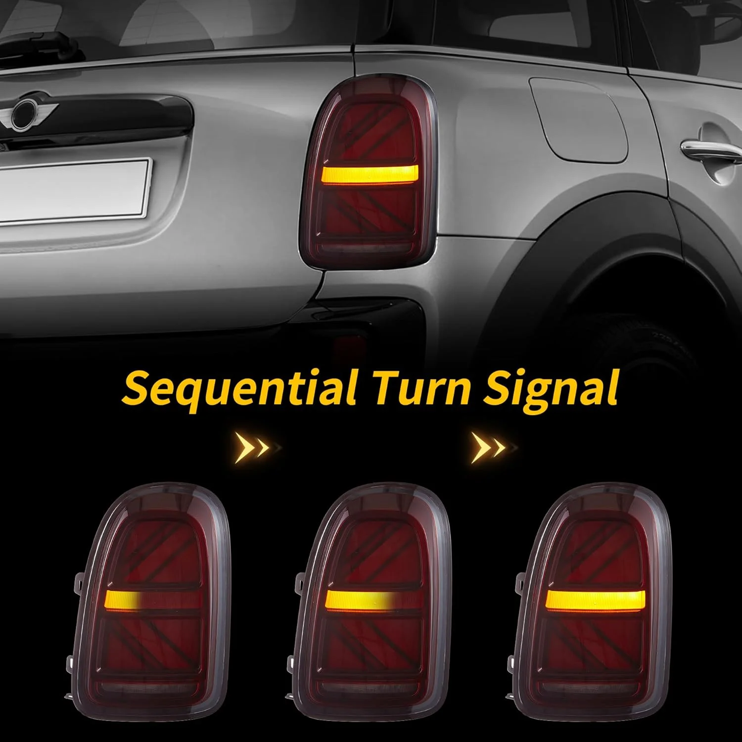 Alter, diese VLAND Rückleuchten für den Mini Countryman R60 sind ja der absolute Hammer! Die machen deinen Mini direkt zum Hingucker.\n\nMit sequentiellen Blinkern die richtig was hermachen - das sieht einfach mega modern aus! Und das Beste: Sie haben das E-Prüfzeichen und sind damit offiziell zugelassen.\n\nKompatibel mit Mini Countryman R60 von 2010-2016 - egal ob Base, Cooper, S, D, WRC oder John Cooper Works. Einfach Plug-and-Play montieren, keine Codierung nötig!\n\nEs gibt zwei Farben zur Auswahl: Rot oder geräuchert, beide mit verchromtem Außenring. Voll-LED-Technik mit Bremslicht, Tagfahrlicht, Blinker, Rückfahrlicht und Nebellicht - alles dabei!\n\nIP67 wasserdicht, stoßfest und mit 1 Jahr Garantie. Professionelle Installation wird empfohlen, dauert aber nur etwa 1 Stunde. Mach deinen Mini unverwechselbar!