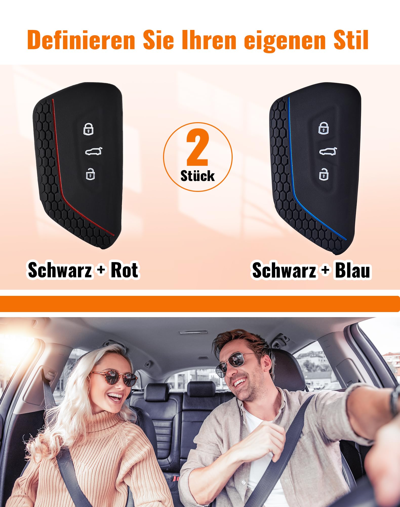 Schütze deine Autoschlüssel vor Kratzern und Stößen! Dieses 2er Set Silikon-Hüllen passt perfekt für VW, SEAT, Skoda und Cupra Modelle. Kompatibel mit Golf 8, e-Golf, ID3, ID4, Leon, Octavia und vielen weiteren Modellen ab 2020. Die weichen TPU-Silikon-Hüllen sind in schwarz-rot und schwarz-blau erhältlich - so findest du deine Schlüssel schneller und verleihst ihnen einen individuellen Look. Das strukturierte Material liegt angenehm in der Hand und verhindert das Wegrutschen. Alle Funktionen deines Keyless-Go-Schlüssels bleiben voll erhalten - die Hülle beeinträchtigt die Signalübertragung nicht. Einfach über den originalen Schlüssel stülpen und schon ist er vor Staub, Flüssigkeit und Beschädigungen geschützt. Besonders praktisch: Die leichten Hüllen wiegen kaum etwas und fallen in der Tasche nicht auf. Ein tolles Geschenk für VW-Gruppen-Fahrer oder einfach für dich selbst, um deine Schlüssel in Top-Zustand zu halten. Mit zwei Hüllen im Set hast du sogar Ersatz oder kannst einem Familienmitglied eine schenken!