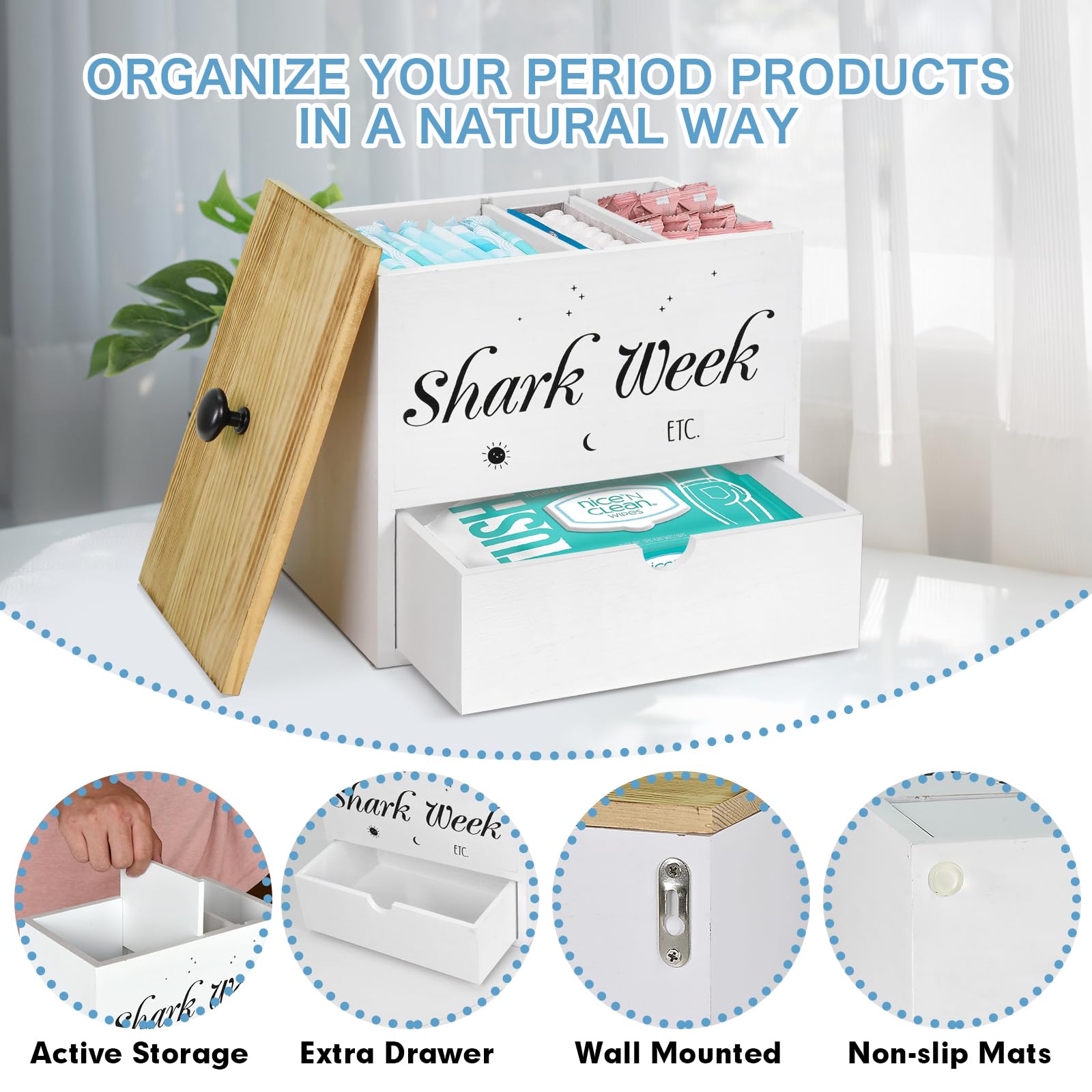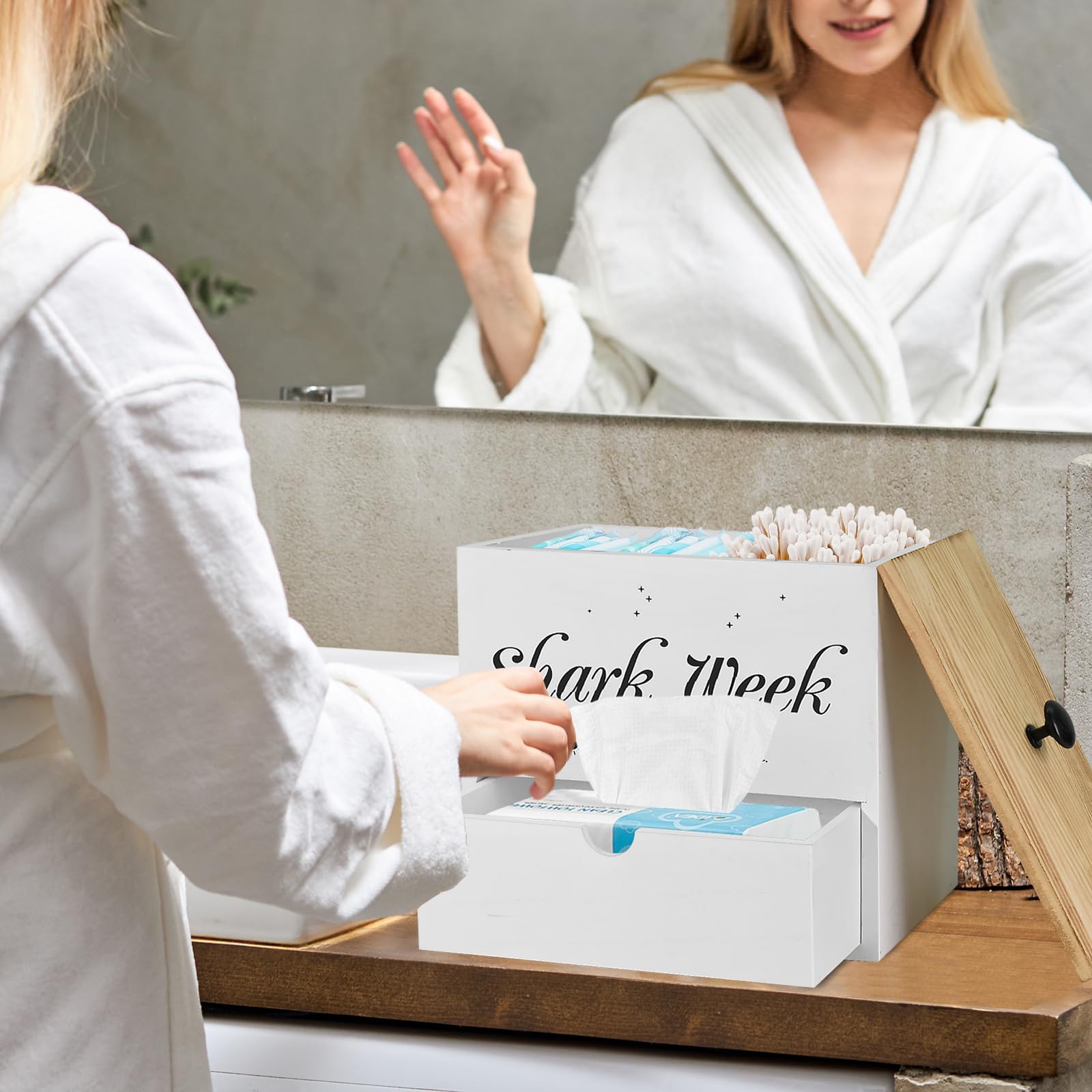 Endlich mal was Schickes fürs Badezimmer! Diese Holz-Box versteckt Tampons und Binden diskret, aber griffbereit. Sieht viel besser aus als die Originalverpackung. \\n\\nAus massivem Holz mit schützender Beschichtung - hält auch die feuchte Badezimmer-Luft aus ohne Flecken zu bekommen. Der Deckel sorgt für Diskretion und Schutz vor Staub. \\n\\nSuper stabiler Boden, damit nichts verrutscht. Perfekt fürs Gästebad oder den eigenen Wellness-Bereich. Sieht aus wie ein Deko-Stück, ist aber mega praktisch. \\n\\nAuch super als Einzugsgeschenk oder für die Reise. Mach dein Bad endlich stylish und organisiert! \\n\\nMaße: 23,9x22,6x14,2cm \\nMaterial: Massivholz \\nFeatures: Mit Deckel, staubgeschützt \\nEinsatz: Bad, Schlafzimmer, Reise