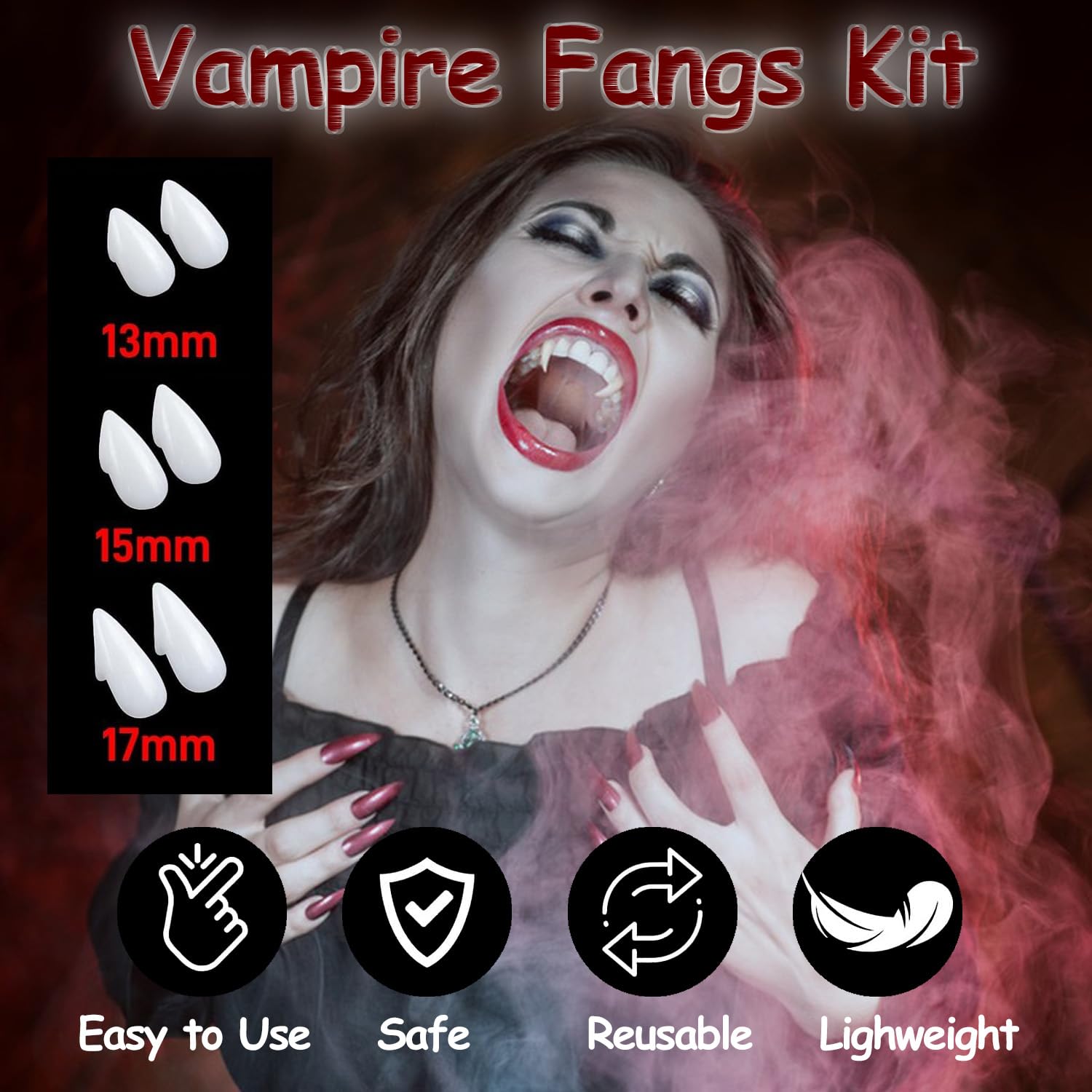 Perfekt für die Gruselparty! Dieses Vampir-Zähne Set bringt den ultimativen Horror-Look. Mit drei Größen (13mm, 15mm, 17mm) für Erwachsene und Kinder - da findet jeder die passenden Fangs! Aus sicherem Kompositharz, das angenehm zu tragen ist. Der Kleber ist einfach anzuwenden: Mit heißem Wasser aktivieren, auf die Zähne drücken und 30 Sekunden warten - schon sitzen sie bombenfest! Das Design ist so realistisch, dass du aussehen wirst wie ein echter Vampir aus dem Film. Ob für Halloween, Cosplay oder Mottopartys - mit diesen Zähnen bist du der Star der Veranstaltung! Einfach zu verwenden und wieder zu entfernen. Mach dein Kostüm komplett und erschrecke deine Freunde!