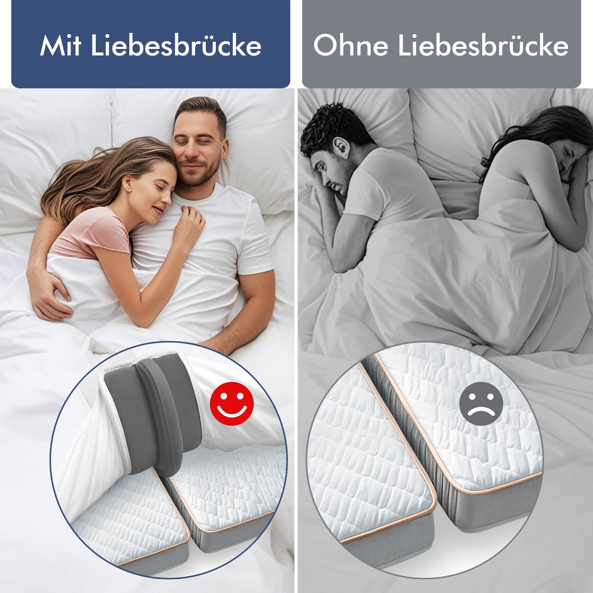 Schluss mit der lästigen Matratzenritze! Unsere Liebesbrücke für 180x200 cm Betten verbindet zwei Einzelmatratzen (je 90x200 cm) zu einer gemütlichen Ganzfläche. Mit integriertem Spannbettlaken und Anti-Rutsch-Bezug - nichts verrutscht mehr! Die Steghöhe von 30 cm passt perfekt zu Matratzen bis 28 cm Höhe. Einfache Montage: • Bezüge abnehmbar • 60°C waschbar • Auch alleine machbar • Kein Werkzeug nötig Das Material ist super weich und hochwertig verarbeitet. Die Brücke ist genau die richtige Stärke - man spürt sie kaum, aber die Ritze ist weg! Endlich wieder kuscheln ohne störende Lücke! Perfekt für Paare, die auf getrennten Matratzen schlafen, aber keine Trennung spüren wollen. So schläfst du fast wie auf einer durchgehenden Matratze - nur flexibler! Gute Nacht, lästige Ritze!