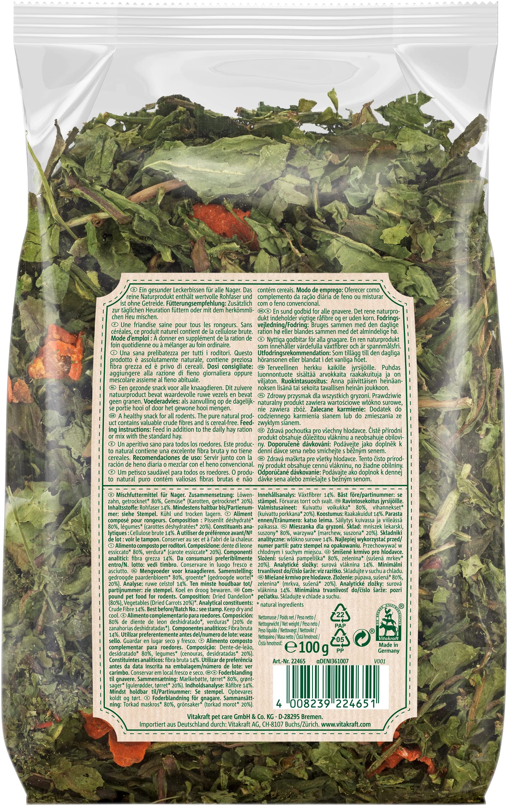 Deine kleinen Nager werden verrückt sein nach diesen Leckerlis! Vitakraft Vita Verde mit Löwenzahn und Karotten ist komplett ohne Zucker, Getreide, Farbstoffe oder künstliche Aromen. Löwenzahn stimuliert die Leber und fördert die Verdauung, Karotten liefern wichtige Vitamine. Der hohe Rohfaseranteil ist super für die Verdauung und das Kauen hilft bei der natürlichen Zahnpflege. Beugt Übergewicht vor und unterstützt das Harnsystem. Perfekt für Hamster, Mäuse, Kaninchen und alle anderen Nagetiere. 6 Packungen mit je 100g - da hast du lange was davon! Vitakraft Qualität, auf die du vertrauen kannst. Einfach mal ausprobieren und deine Tierchen verwöhnen!