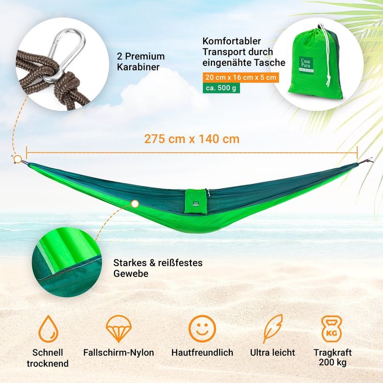 Mit 200 kg Tragkraft hält die Hängematte problemlos zwei Erwachsene aus. Das ist doppelt so viel wie bei normalen Modellen! Das Nylon ist militärischer Qualität und die Gurte sind extra stabil.