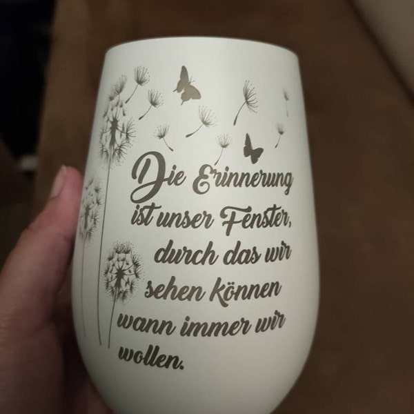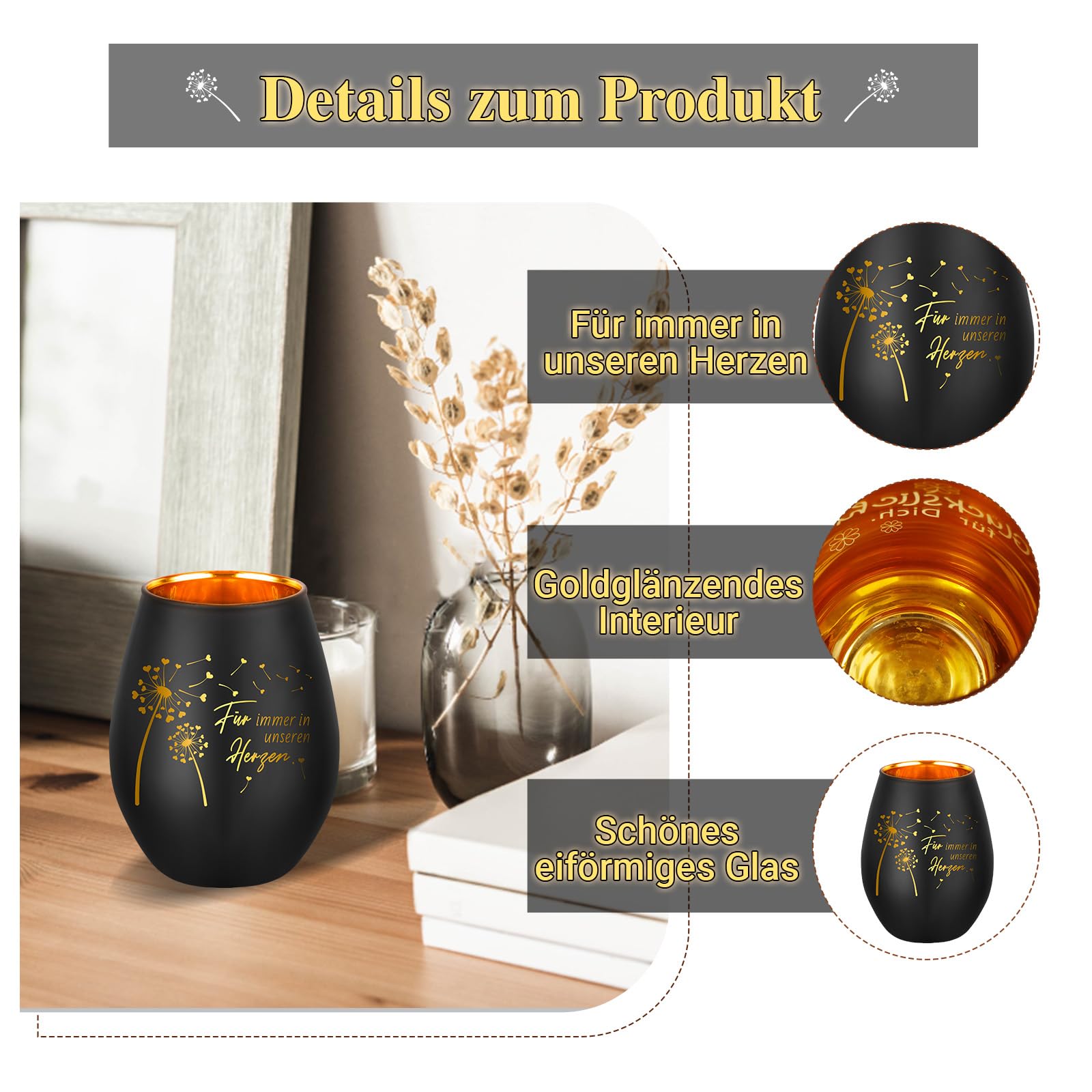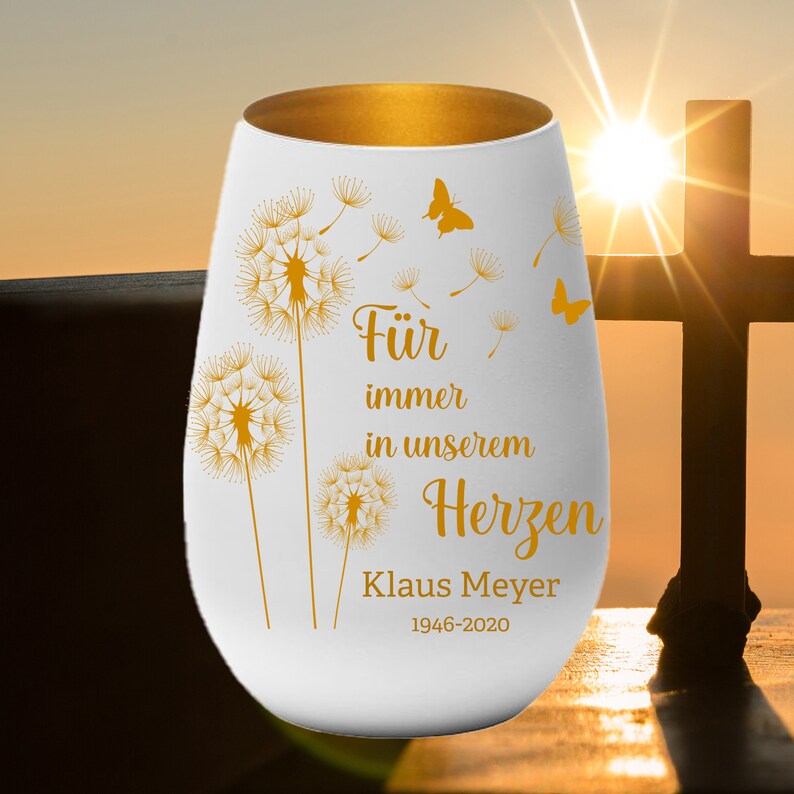 Manchmal sagen Lichter mehr als Worte... Dieses Trauerwindlicht mit der berührenden Gravur 'Für immer in unserem Herzen' spendet Trost in schweren Zeiten. Aus hochwertigem Glas gefertigt, 12x12x14cm groß, mit edler Goldoptik im Inneren. Einfach eine Kerze reinsetzen (separat kaufen) und das sanfte Licht erinnert an geliebte Menschen. Perfekt für die Beerdigung, neben der Urne, zu Hause oder als Grabdekoration. Eine wunderschöne Alternative zu Blumen oder Karten - persönlicher und langlebiger. Das Pusteblumen-Design symbolisiert Loslassen und Erinnerung. Ein Geschenk, das wirklich von Herzen kommt und den Hinterbliebenen Trost spendet. In weiß-goldener Ausführung einfach zeitlos schön.