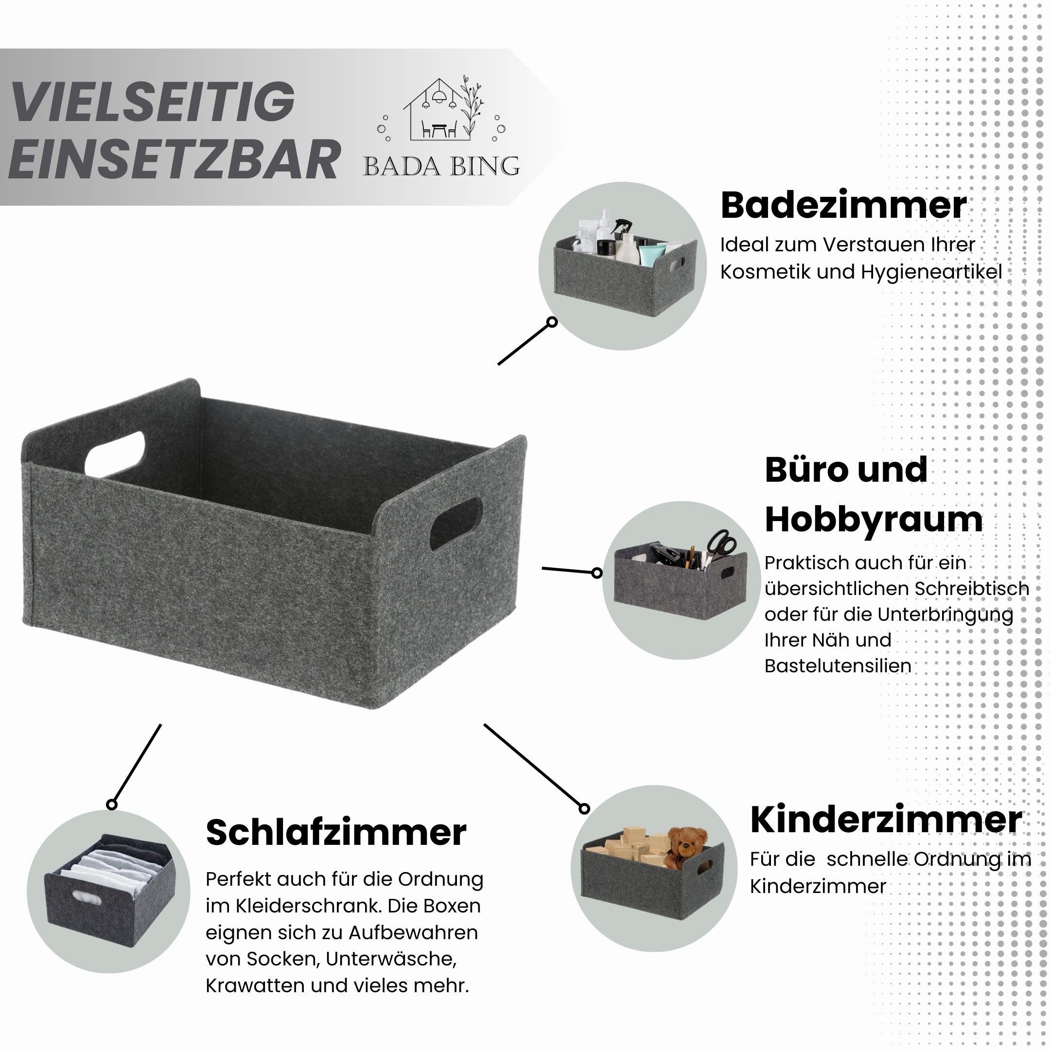 Endlich Ordnung im Chaos! Diese beiden filzigen Aufbewahrungskörbe in Dunkelgrau sind deine neuen besten Freunde. Mit 31x25x15cm passen sie perfekt in jeden Schrank, jedes Regal oder unters Bett. Der stabile Boden verhindert, dass sie zusammenklappen, und die praktischen Griffe machen das Herausziehen zum Kinderspiel. Aus weichem aber robustem Polyesterfilz - super für Kleidung, Spielzeug, Kosmetik oder Bürobedarf. Wenn du sie nicht brauchst, einfach zusammenfalten und platzsparend verstauen. Die perfekte Lösung für mehr Übersicht in Wohnzimmer, Kinderzimmer oder Büro!