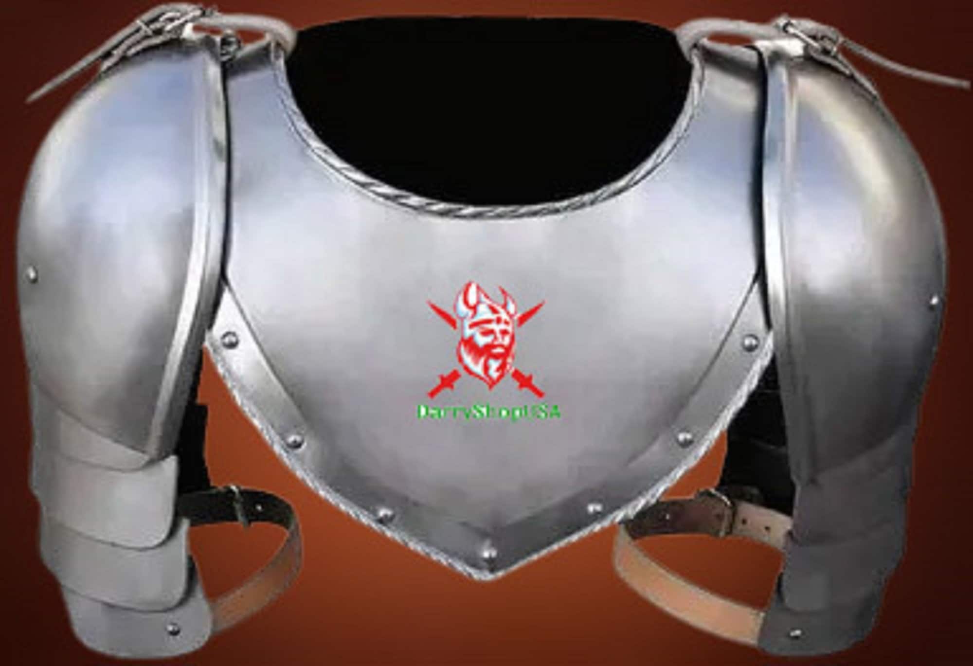 Fühle dich wie ein echter Ritter! Dieses authentische Gorget & Spaulders Set aus 18 Gauge Eisenstahl ist ein echter Hingucker. Handgefertigt in Indien mit verstellbaren Lederriemen. Naturstahl-Finish, geölt geliefert. Perfekt für Reenactment, Cosplay oder als Dekoration. Einheitsgröße für Erwachsene passt fast jedem. Von innen mit rostfreier Farbe beschichtet. Jedes Stück ein Unikat durch Handarbeit. Ob für Mittelalterfest, LARP oder Sammlung - dieses Set beeindruckt! Tauche ein in die Welt der Ritter und Wikinger.