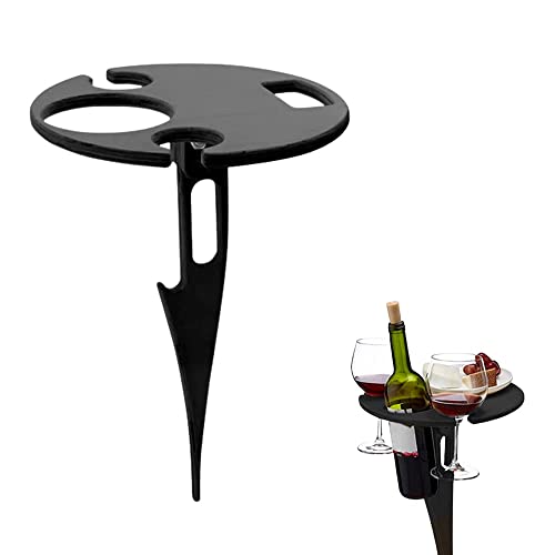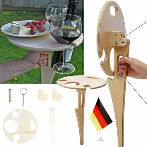 Wow, dieser klappbare Weintisch ist echt ein Game-Changer für alle Weinliebhaber! Stell dir vor: Du machst Picknick im Park oder Camping in der Natur und hast deinen eigenen Weintisch dabei. Der bietet Platz für eine ganze Flasche Wein, zwei Gläser UND noch einen Teller für Snacks. Das Beste? Er lässt sich super einfach zusammenklappen und ist super leicht zu transportieren.\\n\\nAus robustem Holz gefertigt, hält er was aus und steht stabil im Gras, Sand oder auf Wiesen. Einfach den Stab in den Boden stecken - schon steht dein persönlicher Weinservice! Perfekt für romantische Abendessen im Freien, Gartenpartys oder den nächsten Strandausflug.\\n\\nMaße: Aufgebaut ca. 20cm Durchmesser x 30cm hoch, zusammengeklappt nur 40cm lang. Es gibt verschiedene Ausführungen - in Holzoptik oder schwarz, einstufig oder zweistufig. Lieferung inklusive aller nötigen Schrauben.\\n\\nAchtung: Bitte nur auf ebenen Flächen verwenden und nicht überlasten. Und denk dran - immer schön fest im Boden verankern, dann steht deinem Weinvergnügen nichts im Weg!
