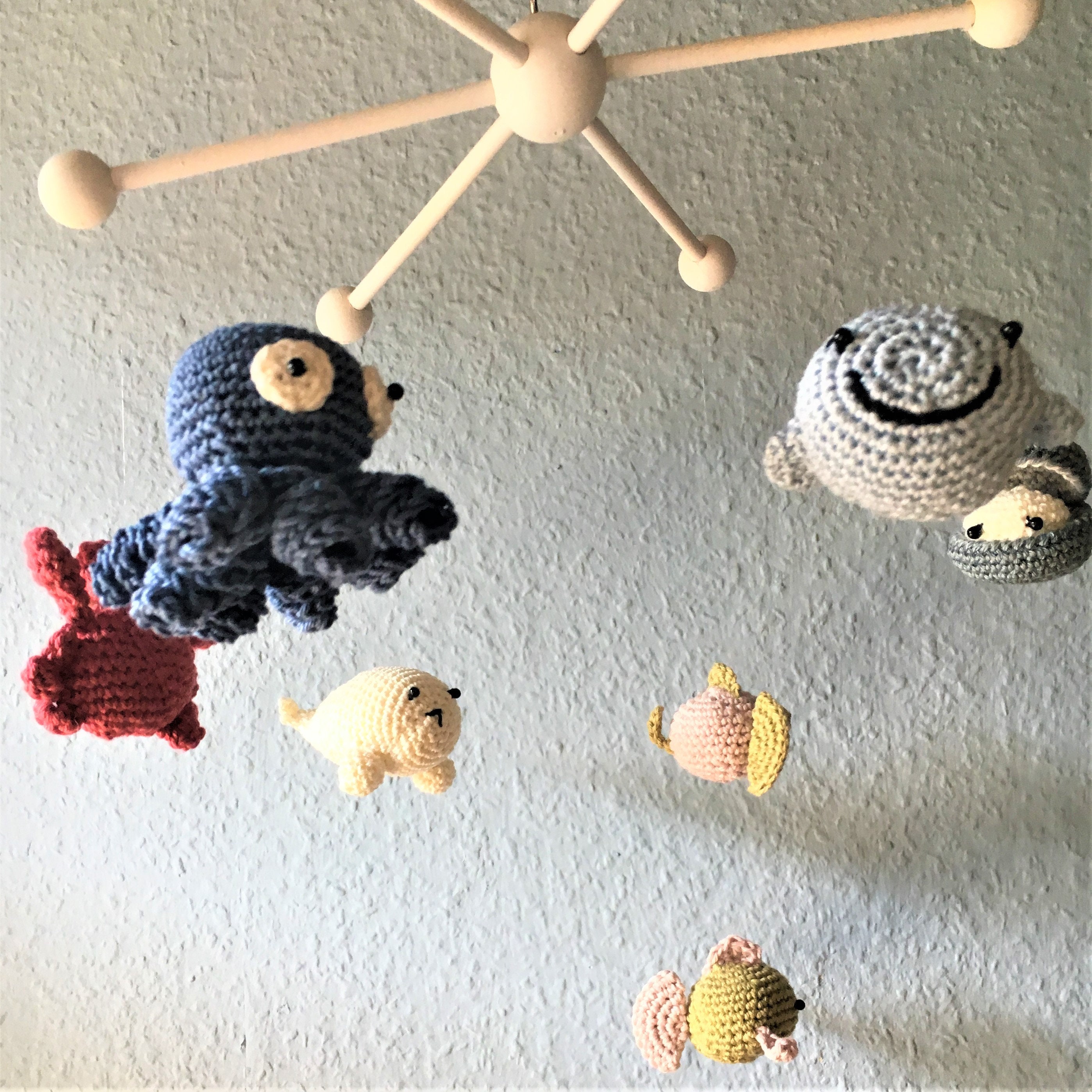 Tauch ab in die bunte Unterwasserwelt! Dieses niedliche Meerestiere-Mobile bringt Farbe und Freude ins Babyzimmer. Mit süßen Filz-Figuren wie Seepferdchen, Fischen, Korallen und Seesternen an einer 500 cm langen Baumwollschnur. Das Mobile ist komplett handgefertigt und aus hochwertigen Materialien - das Holz ist stabil, der Filz verknäult nicht. Die leuchtenden Farben fördern die visuelle Entwicklung deines Babys, und die sanften Bewegungen helfen beim Einschlafen. Du kannst es nicht nur über dem Bettchen aufhängen, sondern auch in der Spielkiste oder als Deko im Wohnzimmer. Und als Geschenk zur Taufe oder zum Geburtstag ist es einfach perfekt! Hol dir dieses bezaubernde Mobile und lass dein Baby in eine Welt voller Meerestiere eintauchen.