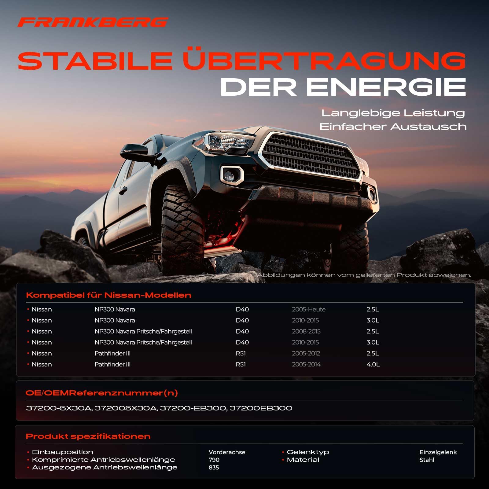 Perfekter Achsen-Ersatz für Deinen Nissan Navara! Dieses Set mit 2 Antriebswellen für die Vorderachse passt exakt für Navara Pritsche/Fahrgestell D23 2.3L (2015-2019), NP300 Navara Pick-up D23 2.3L/2.5L (2015-2019) und Alaskan 2.3L (2017-2025). Wichtig: Nur für Automatikgetriebe geeignet! Bevor Du kaufst, unbedingt die Passform überprüfen - nutze das 'Amazon confirmed fit' Tool oder gib Deine HSN/TSN ein. Technische Daten: Länge ca. 640 mm, Außenverzahnung Radseite 29, Diff-Seite 30. Hochwertiges Stahlmaterial mit hoher Festigkeit und guter Ermüdungsbeständigkeit. Chloropren-Kautschuk für ausgezeichnete Verschleißfestigkeit. Passt zu folgenden Produktnummern: 391004JA0A, 391004JA0B, 391004JA2A, 18-063100. Einfacher Einbau und zuverlässige Performance für Deinen Pick-up! Qualitätsersatzteil das hält, was es verspricht.