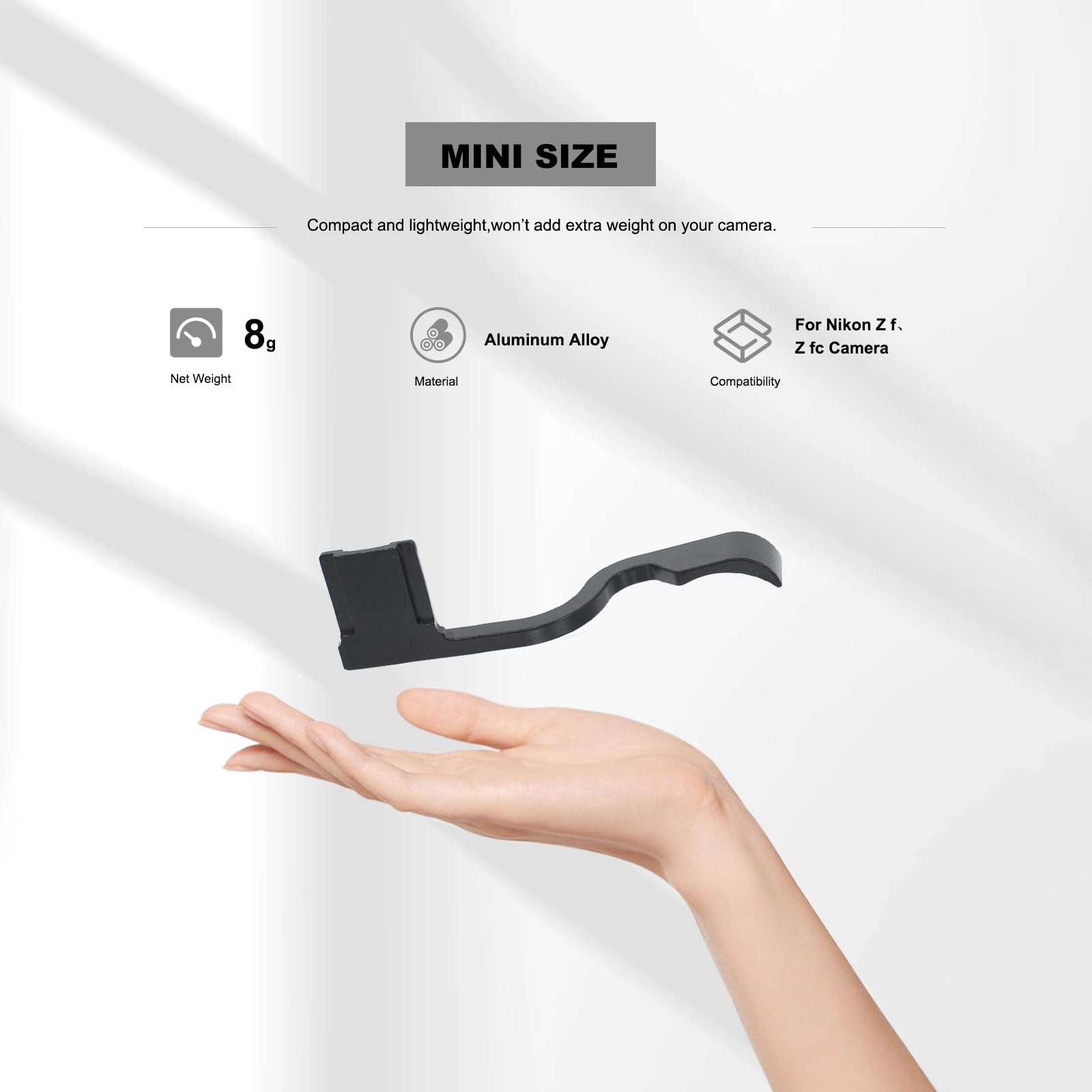 Verbessere den Halt deiner Nikon Z fc mit dieser praktischen Daumenstütze von AKIROOD! Aus eloxierter Aluminiumlegierung gefertigt, gibt sie dir mehr Kontrolle und Komfort beim Halten der Kamera - besonders wichtig bei längeren Shooting-Sessions oder wenn du größere Objektive verwendest.
