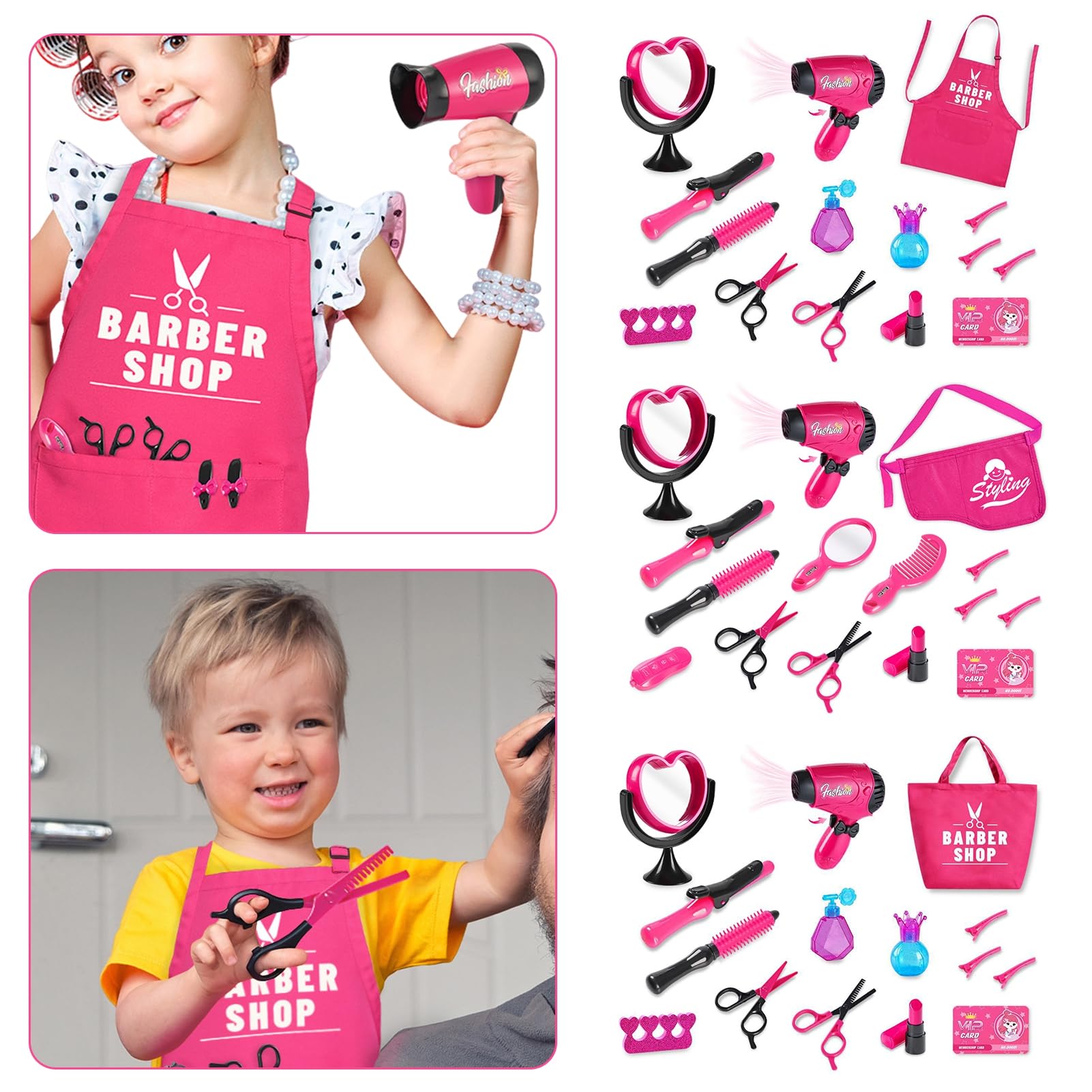 Für alle kleinen Friseurmeisterinnen! Dieses total süße Beauty-Spielset lässt Mädchenherzen höher schlagen. Mit allem, was eine echte Friseurin braucht: Lockenstab, Haartrockner, Kamm, Schere und sogar Shampoo-Fläschchen. Alles aus stabilem Holz gefertigt, das auch wildeste Spielstunden übersteht. Die kleinen Hände können damit super umgehen und der Kreativität freien Lauf lassen. Perfekt für Rollenspiele - ob alleine oder mit Freundinnen. Fördert die Feinmotorik und die Fantasie deines Kindes. Maße: 20 x 22 x 6 cm - kompakt genug fürs Kinderzimmer, aber mit allem wichtigen Zubehör. Ein ideales Geschenk für Geburtstage, Weihnachten oder einfach so. Deine Tochter wird stundenlang beschäftigt sein und sich fühlen wie in einem echten Salon. Einfach auspacken und losstylen!