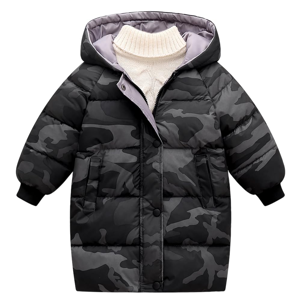 Perfekte Winterjacke für aktive Jungs! Dieser L SERVER Parka hält dein Kind bei jedem Wetter warm und trocken. Mit wind- und wasserdichtem Material und weicher Baumwollfüllung - ideal für kalte Wintertage.\\n\\nPraktische Features:\\n• Abnehmbare Kapuze für flexiblen Tragekomfort\\n• Große Taschen für Handschuhe und Schätze\\n• Elastische Bündchen und hoher Kragen gegen kalte Luft\\n• Camouflage-Design - total im Trend bei Kids\\n• Hochwertige Reißverschlüsse mit Anti-Quetsch-Schutz\\n\\nGrößentipps:\\n130 = 122-128cm (58,5cm Länge)\\n140 = 134-140cm (62cm Länge)\\n150 = 146cm (65,5cm Länge)\\n160 = 152-158cm (69cm Länge)\\n170 = 164cm (72cm Länge)\\n180 = 170-176cm (75cm Länge)\\n\\nEinfach super für: Schule, Spielplatz, Skifahren, Wandern oder Radfahren. Macht auch ein tolles Weihnachtsgeschenk! Die Jacke ist robust verarbeitet und hält auch wildesten Spielaktionen stand.