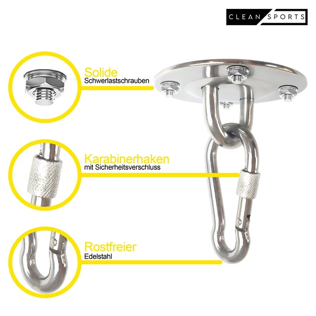 Diese Yourkon Halterung ist ein echter Kraftprotz! Trägt bis zu 230kg - perfekt für Boxsäcke, Hängesessel oder Yogatücher. Aus massivem 1cm Stahl in 4 Varianten: Schwarz, Weiß, Verzinkt oder Edelstahl. Komplettes Montage-Set inklusive - schnell an Wand oder Decke installiert. Korrosionsgeschützt für Innen- und Außenbereich. Mit Karabinerhaken und Ringschraube - einfaches Auf- und Abhängen. Ob fürs Training, Entspannung oder Spiel - diese Halterung hält was aus. Deine Lösung für mehr Flexibilität zu Hause!