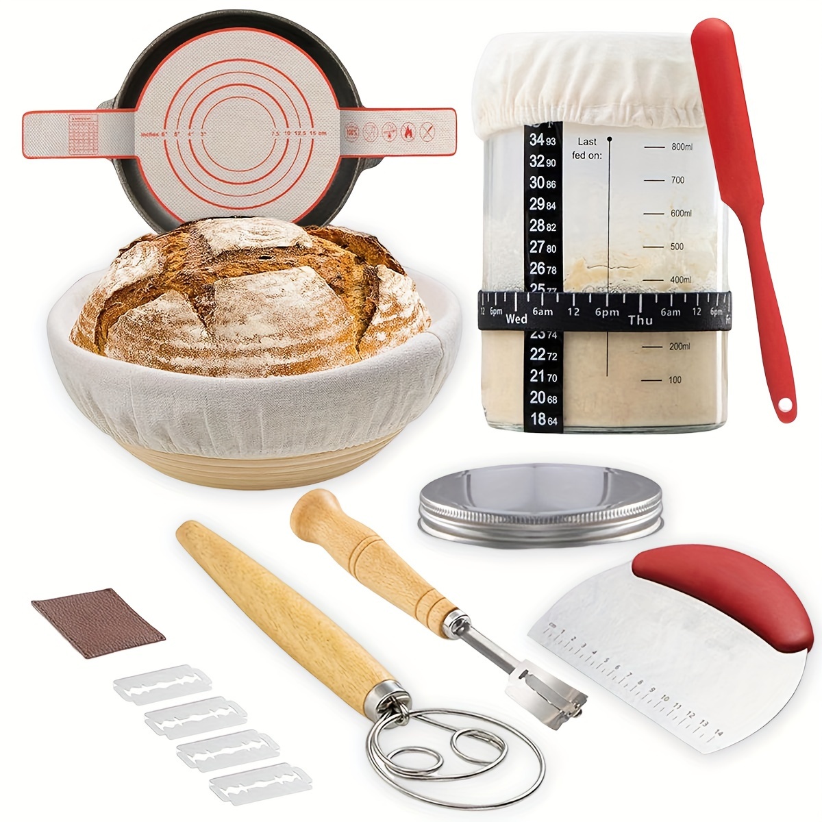 Für alle Brot-Back-Fans! Dieses komplette Sauerteig-Set hat alles, was du brauchst: einen ovalen Gärkorb aus Rattan (25cm/10 Zoll) mit Leinen-Liner, zwei Teigschaber, eine Bambusbürste und einen Schneebesen. Der Rattankorb sorgt für die perfekte Gärung - die offene Struktur lässt Luft zirkulieren und der Teig bekommt diese schöne rustikale Optik. Einfach den Teig rein, gehen lassen und dann backen - das Brot löst sich super leicht. Die Teigschaber sind praktisch zum Portionieren und Formen. Ob Sauerteig, Ciabatta oder anderes Brot - damit backst du wie ein Profi! Sieht in der Küche auch noch total schick aus. Ein Muss für jeden Hobby-Bäcker!
