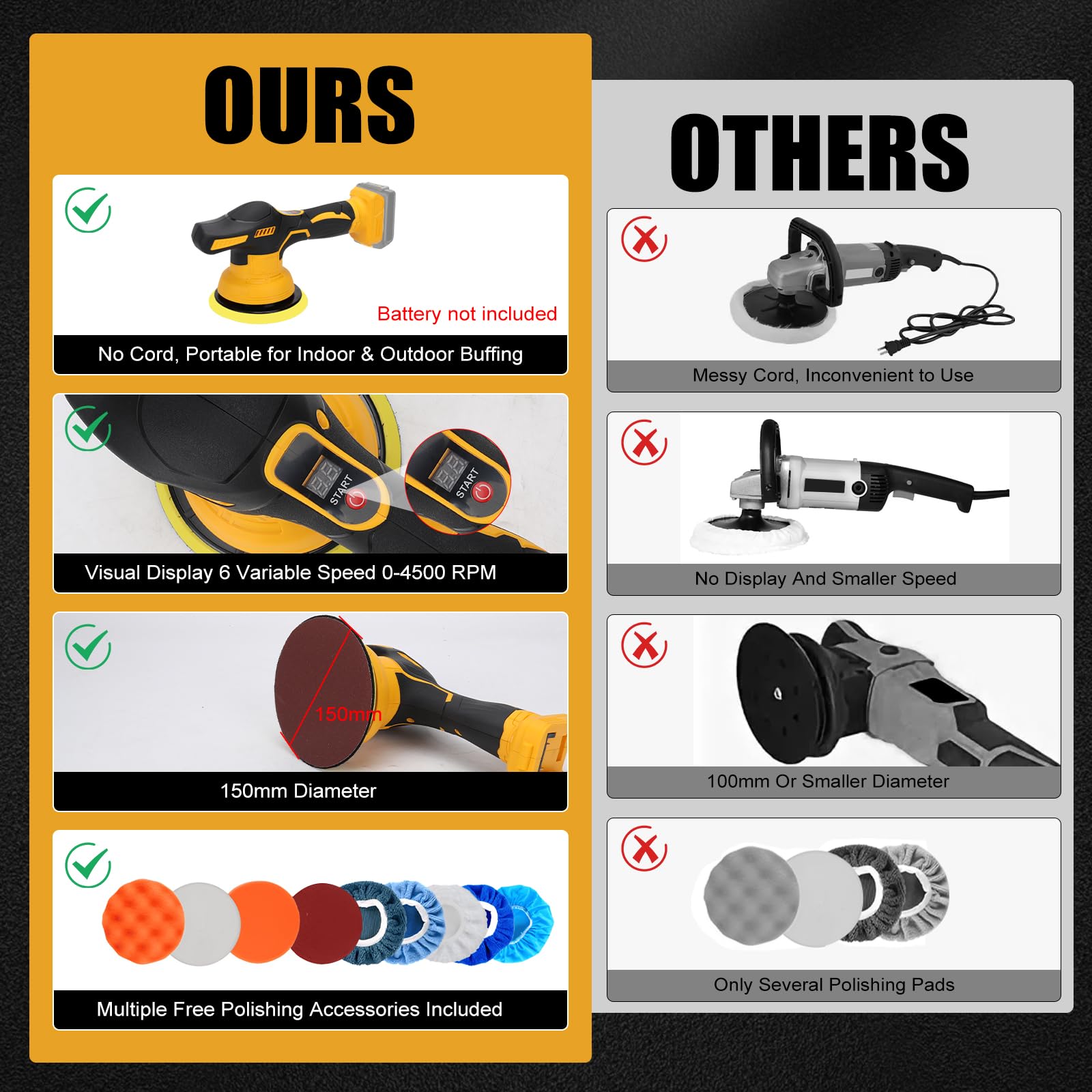Professionelles Polieren ganz ohne Kabel! Diese Poliermaschine von WingFly läuft mit Dewalt 18V/20V Akkus (nicht im Lieferumfang). Mit 450W Leistung und 6 verstellbaren Geschwindigkeiten (2300-5200 U/min). Nur 1,5kg leicht - super handlich! Ideal zum Entfernen von Kratzern, Swirls und zum Versiegeln von Autolack. Auch für Möbel, Boote und Fliesen geeignet. Im Set enthalten: Poliermaschine, 3 Handtücher, Schürze, Handschuhe, 2 Schwammblöcke, Schleifpapier und 7 Wollräder. Ergonomischer Griff für ermüdungsfreies Arbeiten. Mach dein Auto strahlend wie neu - ganz einfach selbst!