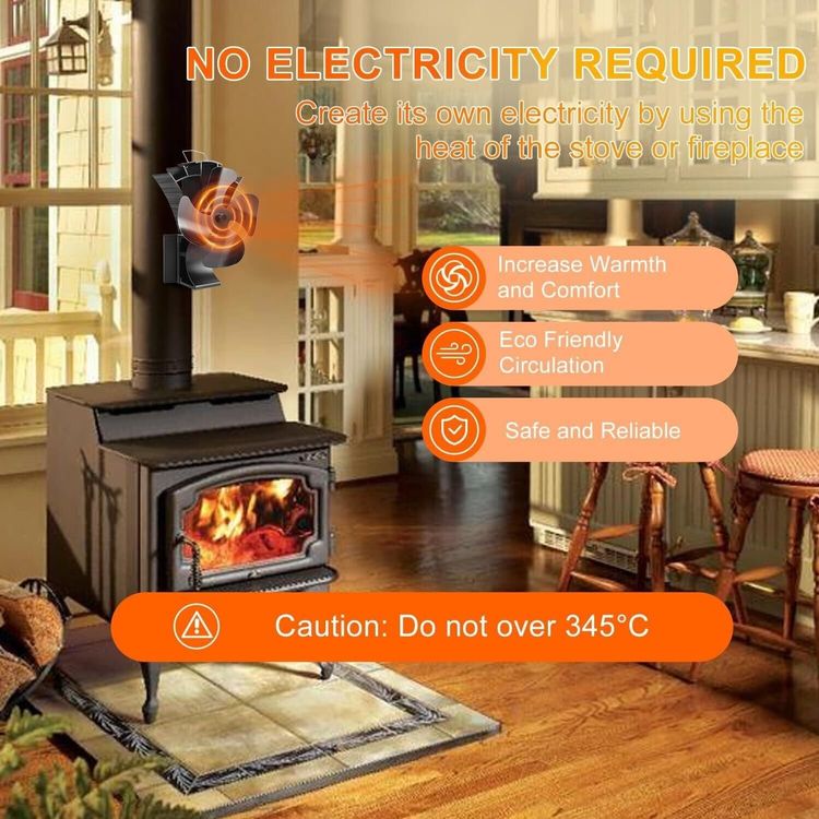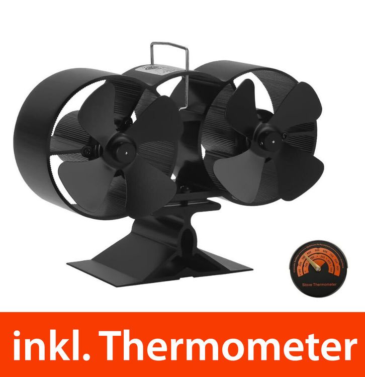 Dein Kamin heizt nur die direkte Umgebung? Mit diesem cleveren Kaminventilator verteilst du die Wärme im ganzen Raum - und das komplett ohne Strom! Der Lüfter wird allein durch die Hitze deines Ofens angetrieben und startet automatisch ab 50°C. \\n\\nDie 5 großen Flügel (200 mm) erzeugen einen kräftigen Luftstrom von 380 m³/h - das ist fast doppelt so viel wie bei herkömmlichen 4-Flügel-Modellen! Die einzigartige 60° Pendelfunktion verteilt die Wärme horizontal im Raum, sodass auch entlegene Ecken schön warm werden. \\n\\nDas spart bares Geld: Tests zeigen bis zu 40% Ersparnis bei den Brennstoffkosten, weil du weniger Holz verbrauchst. Der integrierte Überhitzungsschutz schützt den Lüfter bei extremen Temperaturen - so hält er länger. \\n\\nUnd das Beste: Der Lüfter arbeitet super leise (unter 25 dB). Du spürst nur die wohlige Wärme, aber hörst kaum etwas. Das mitgelieferte Thermometer hilft dir, die Temperatur im Blick zu behalten. \\n\\nEinfach auf den Ofen stellen und von effizienterer Wärmeverteilung profitieren. Perfekt für Holz-, Kohle- oder Pelletöfen!