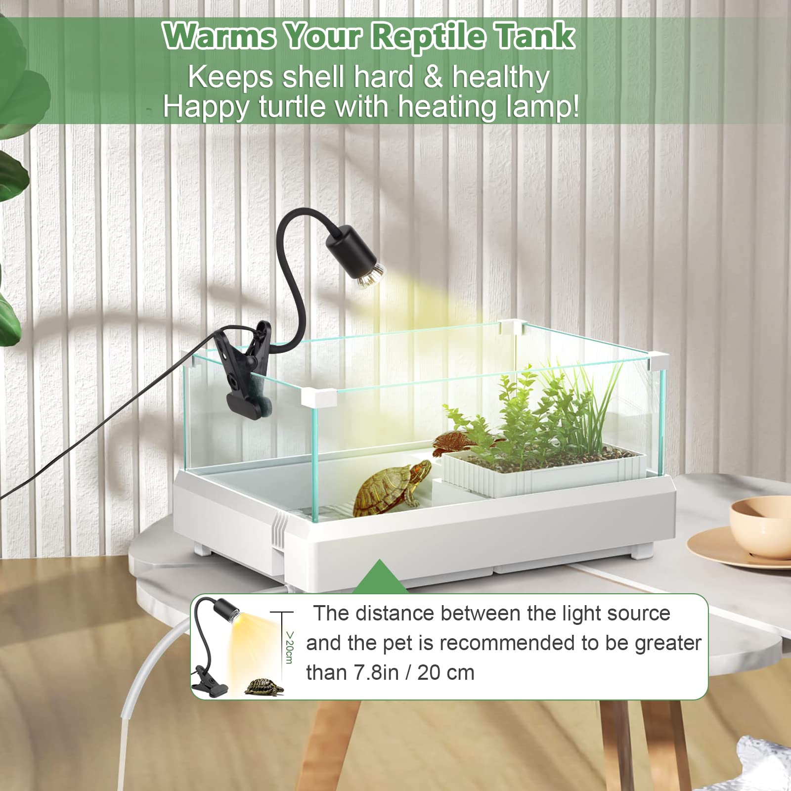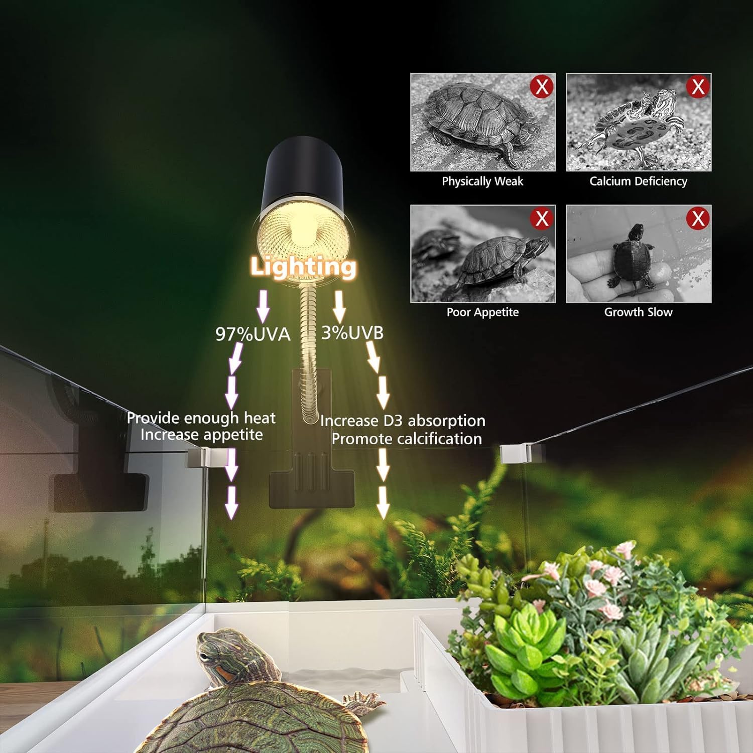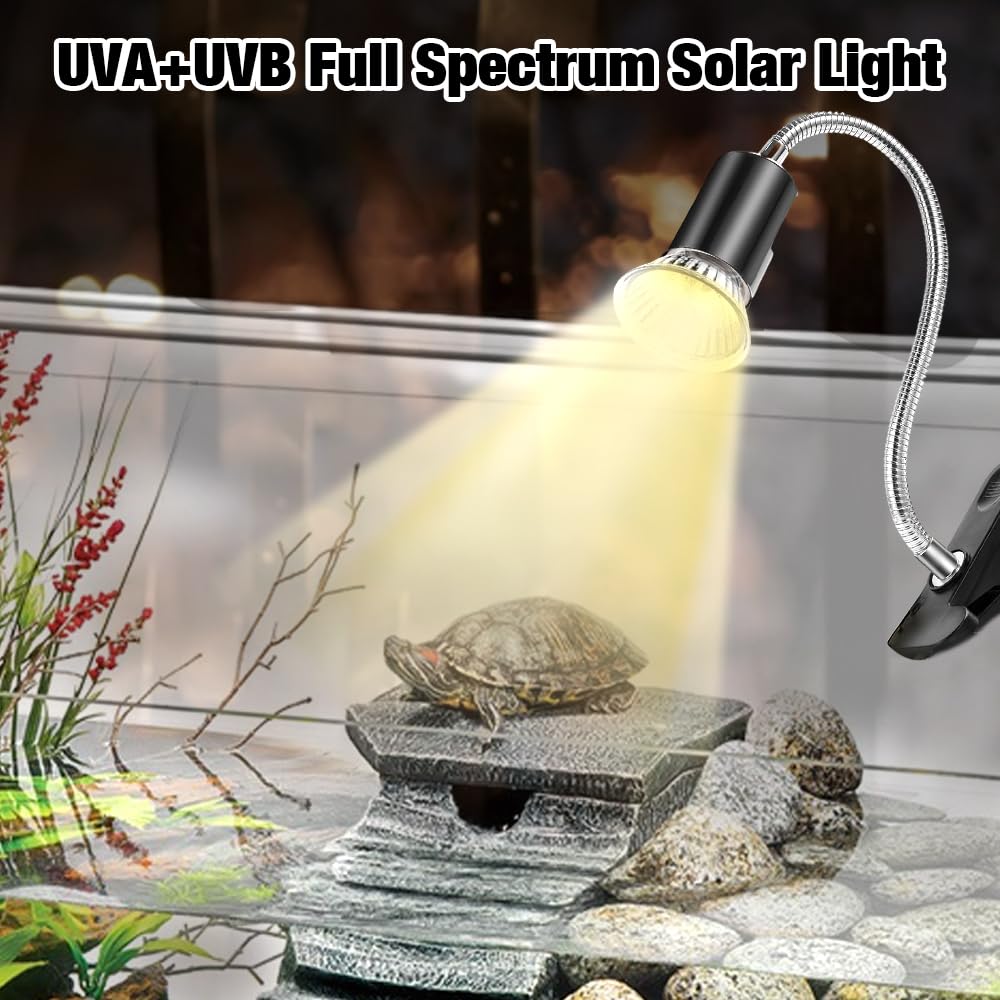 Deine Reptilien brauchen Wärme? Diese 50W Wärmelampe simuliert echtes Sonnenlicht für dein Terrarium! Mit UVA für den Appetit und UVB für die Vitamin-D3-Synthese - genau das, was Schildkröten, Eidechsen, Schlangen und andere Reptilien brauchen. Der Keramik-Sockel ist hitzebeständig und sicher, die Lampe gibt kein grelles Licht ab. Mit praktischem Clip zum Befestigen am Terrarium und 360° drehbarem Kopf - so richtest du die Wärme genau dorthin, wo sie gebraucht wird. Perfekt für alle, die ihren kaltblütigen Freunden ein artgerechtes Zuhause bieten wollen. Einfach in die E27-Fassung schrauben, am Terrarium befestigen und schon fühlen sich deine Tiere wie in ihrer natürlichen Umgebung! Wichtig für gesundes Wachstum und Wohlbefinden deiner Reptilien.