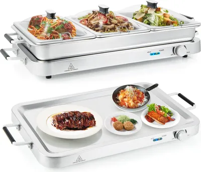 Dieser elektrische Speisenwärmer ist perfekt für deine nächste Party oder Catering-Veranstaltung! Mit 9L Gesamtkapazität (drei einzelne Pfannen à 3L) bleiben deine Gerichte lange warm. Die Temperatur lässt sich stufenlos von 35°C bis 90°C regulieren - ideal für verschiedene Speisen. Aus hochwertigem Edelstahl gefertigt, ist er robust und spülmaschinenfest (nur die Pfannen). Einfach Wasser in den Behälter füllen, einschalten und die Temperatur einstellen. Perfekt für Buffets, Hochzeiten, Firmenfeiern oder Familienfeste. Deine Gäste werden begeistert sein!