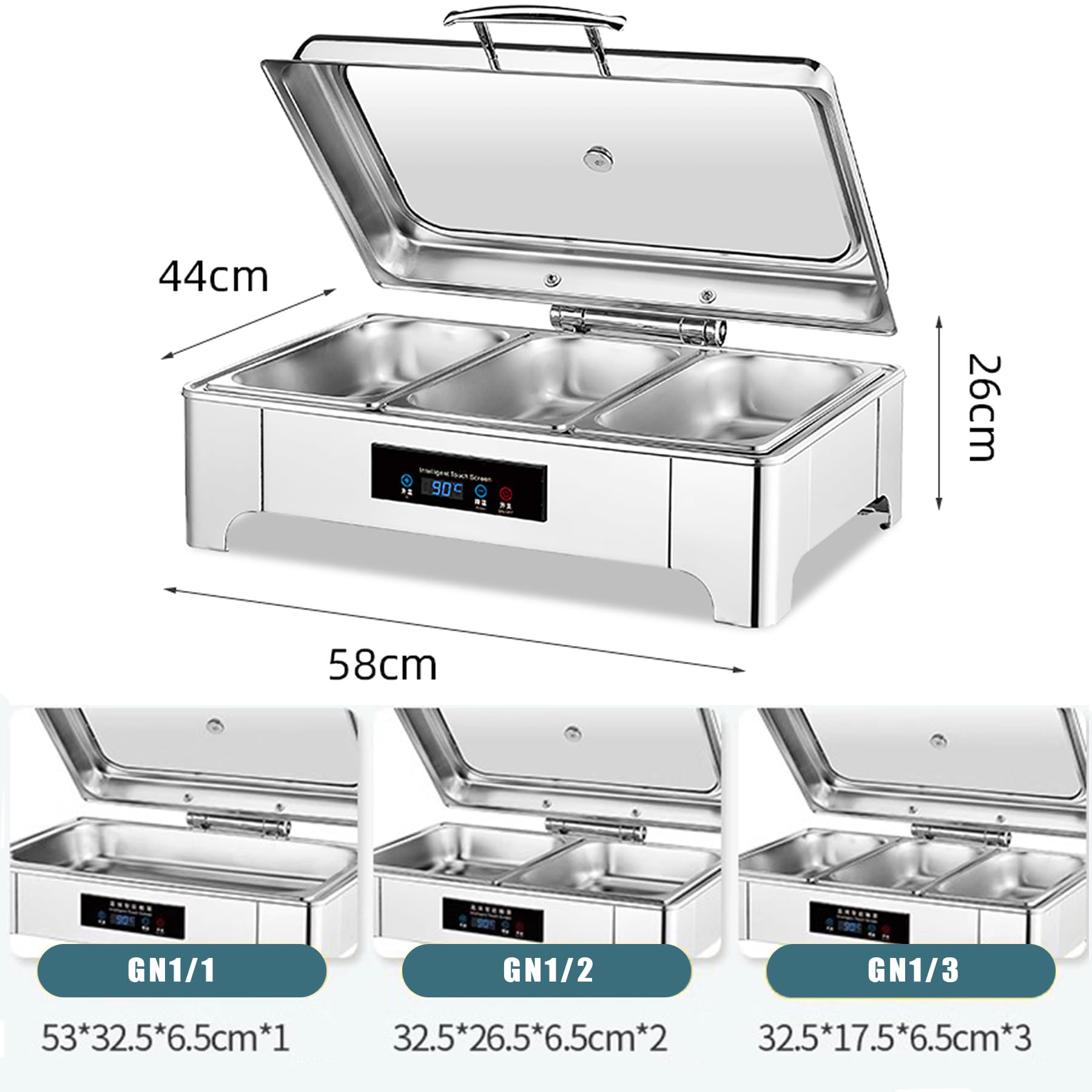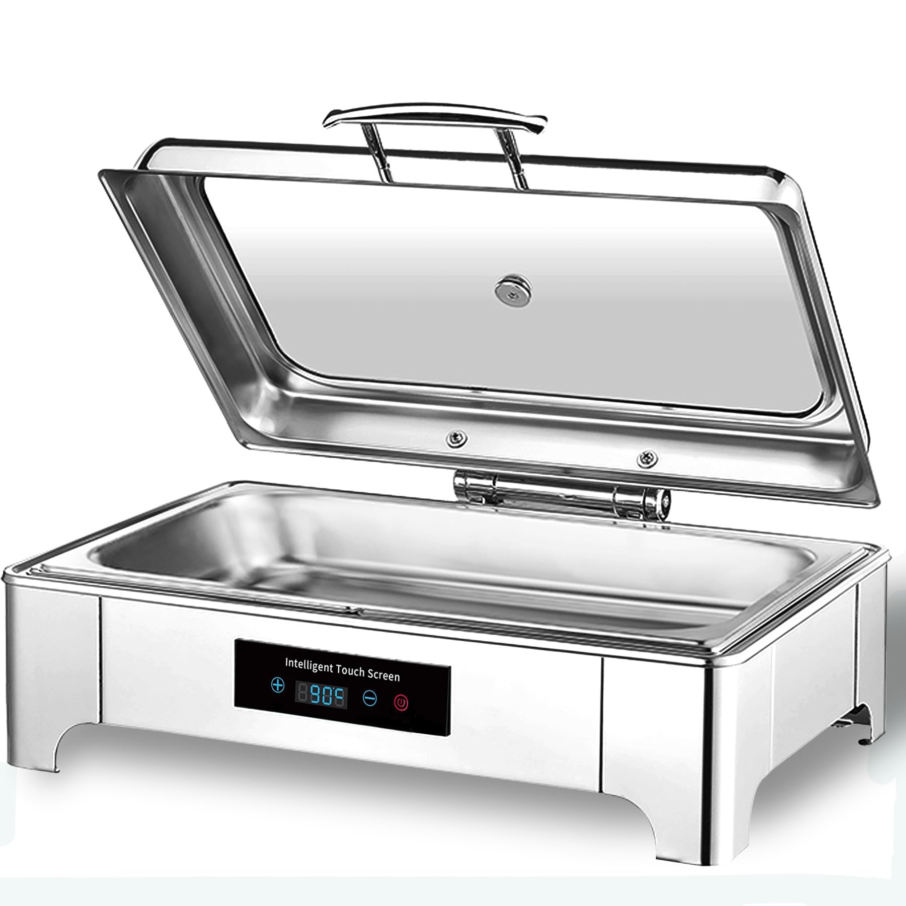 Hey, dieser elektrische Speisewärmer ist der absolute Profi für deine nächste Party! Mit 9 Liter Fassungsvermögen im GN1/1 Format und komplett aus lebensmittelechtem Edelstahl 304 - da ist Hygiene garantiert. Die 400 Watt Leistung heizt schnell und gleichmäßig, und die Temperatur regelst du einfach per Touchscreen von 0-85°C.\n\nDas coole Glasdeckel-Design ist nicht nur stylisch, sondern du siehst sofort, was drin ist ohne ständig öffnen zu müssen. Der hydraulische Puffer lässt den Deckel sanft zufallen - keine eingeklemmten Finger mehr! Die abnehmbare Heizplatte macht die Reinigung super einfach.\n\nPerfekt für Buffets, Hochzeiten, Hotel-Frühstück oder Familienfeiern. Dein Essen bleibt lange warm und lecker, ohne dass du dir Sorgen machen musst. Einfach Wasser einfüßen, Einsatz rein, Strom an und Temperatur einstellen - mehr ist nicht nötig. Dein bester Helfer für gelungene Veranstaltungen!