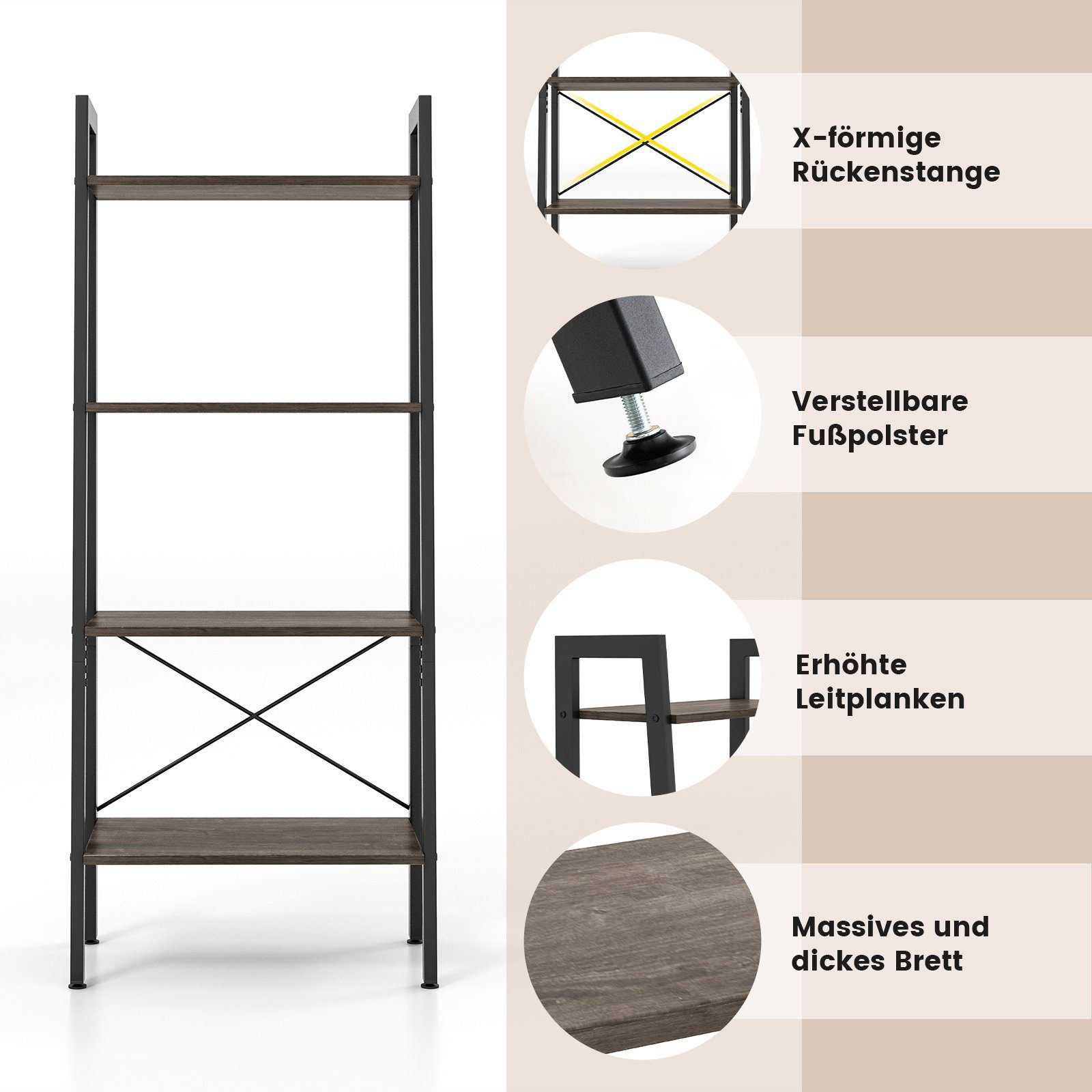 Platzwunder für deine Ecke! Dieses stylische L-förmige Eckregal nutzt jeden Zentimeter Platz optimal aus. Mit 180cm Höhe und 5 geräumigen Ebenen bietet es jede Menge Stauraum für Bücher, Deko, Pflanzen und mehr. Aus robustem Metallrahmen und Holzwerkstoff, trägt bis zu 125kg! Die erhöhten Kanten verhindern das Herunterfallen von Gegenständen. Mit Kippsicherung für Wandbefestigung und verstellbaren Füßen für perfekten Stand. In rustikal braun/Eiche/Nussbaum Optik passt es super in Wohnzimmer, Büro oder Flur. Einfach aufzubauen - inklusive Anleitung. Endlich mehr Ordnung und Stauraum ohne Platz zu verschenken!