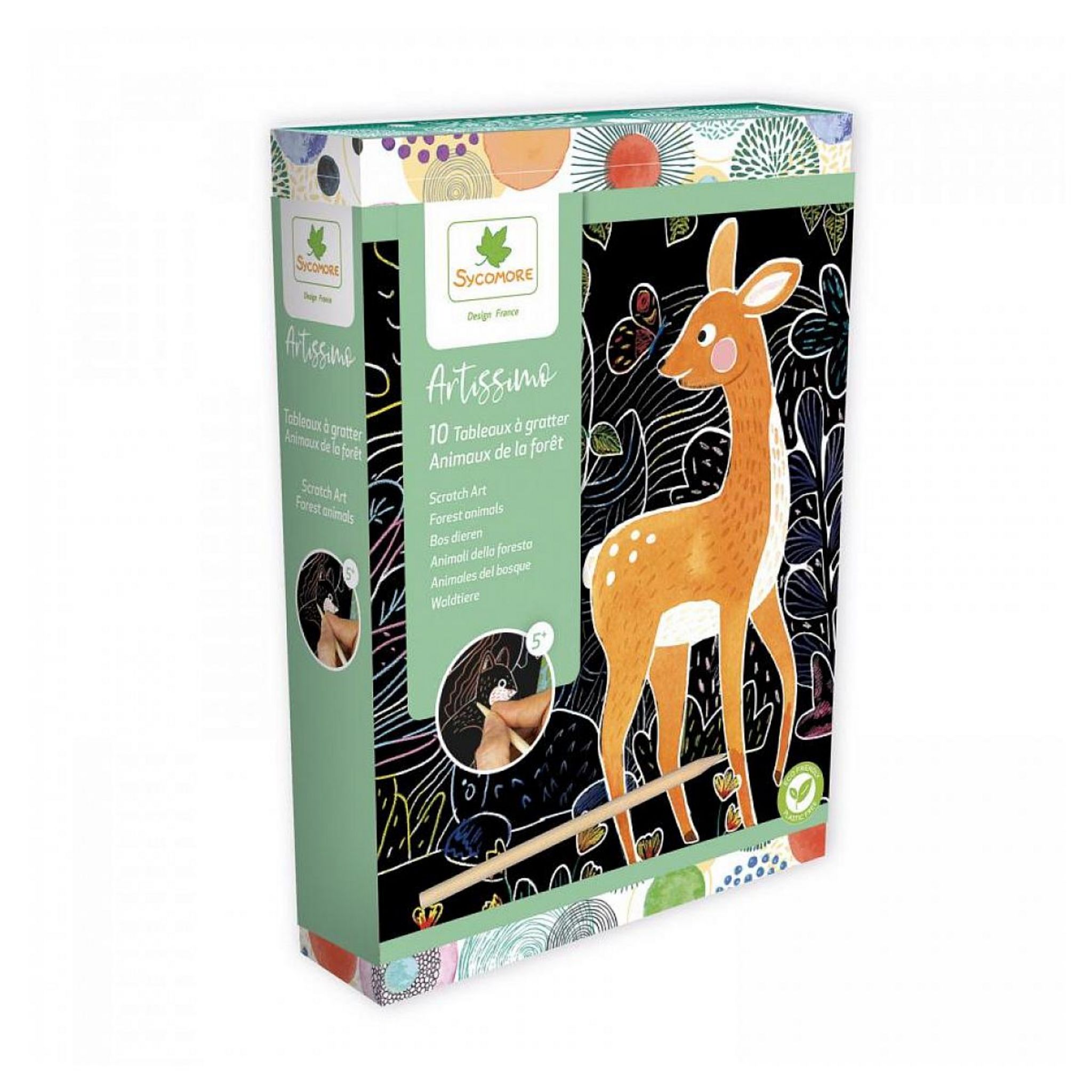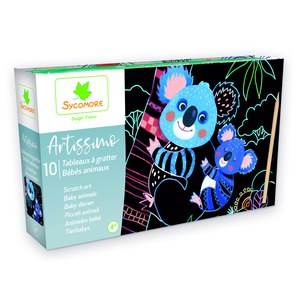 Einfach die schwarze Schicht abkratzen und bunte Muster erscheinen! Einige Teile sind vorgegeben, damit das Bild harmonisch bleibt - super für kleine Künstler, die noch üben. Die Box misst 22x4x26cm und enthält alles: 10 Platten, Holzwerkzeug und Anleitungsheft.