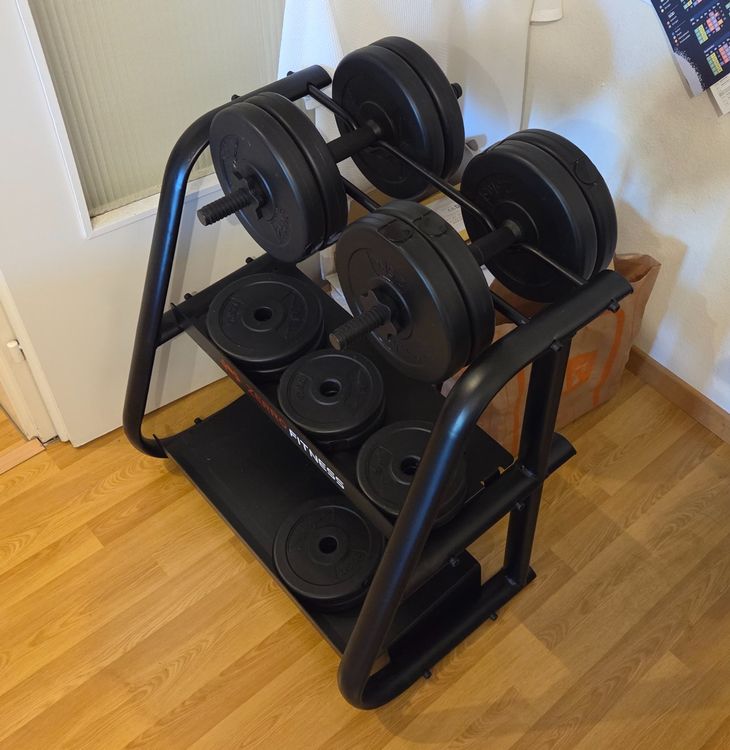 Schluss mit rumliegenden Hanteln! Dieser praktische Hantelhalter bringt Ordnung in dein Home-Gym. 5 Ebenen für bis zu 25kg Gesamtgewicht - alles schön ordentlich und griffbereit.