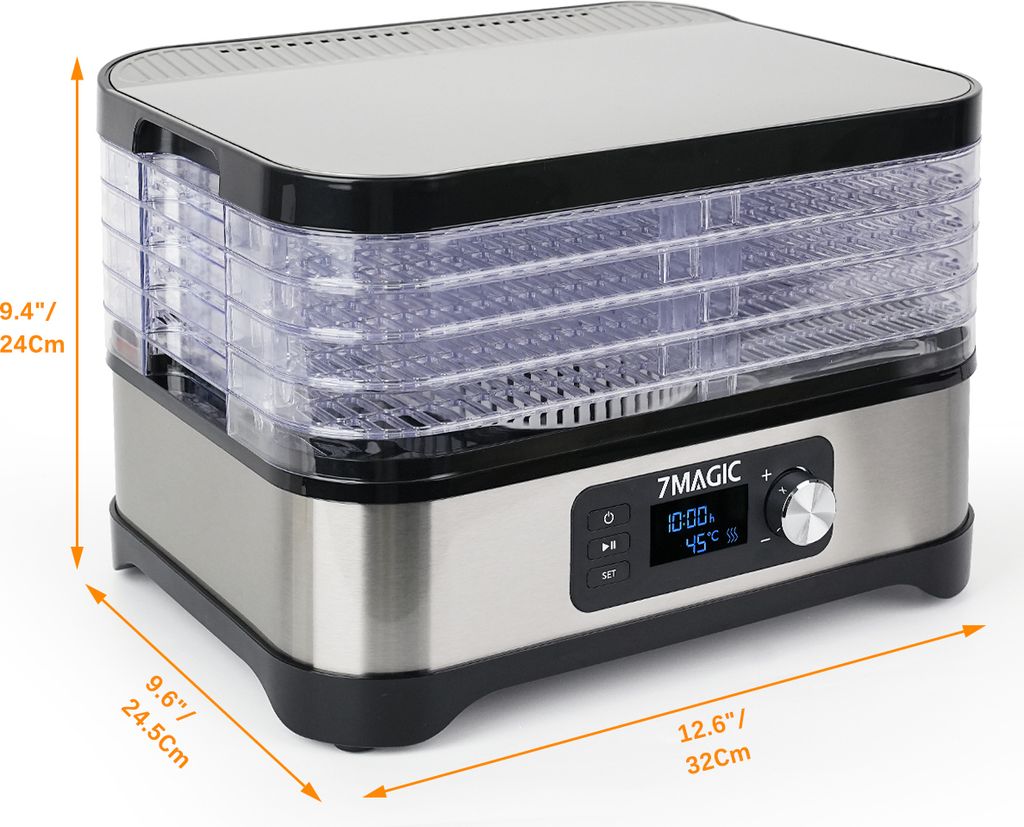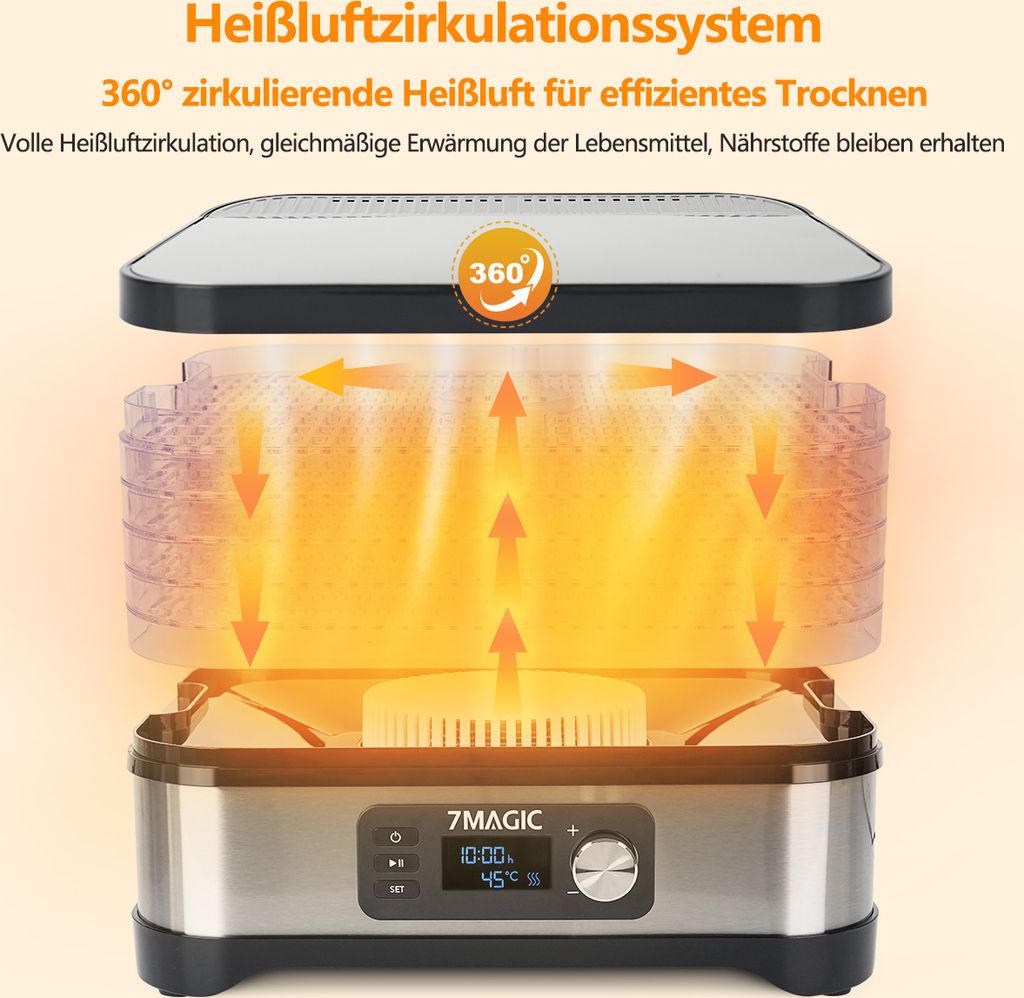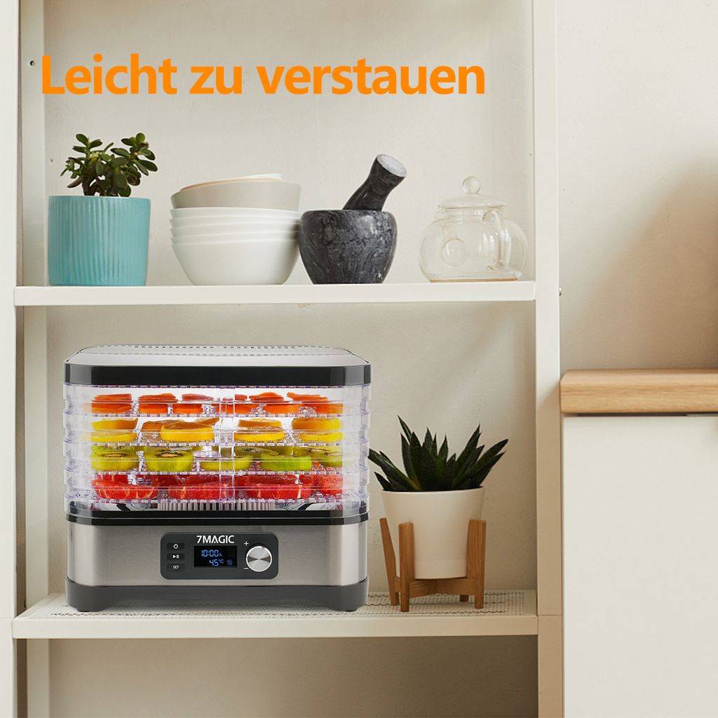 Selbstgemachte gesunde Snacks - ganz easy! Dieser Dörrautomat aus Edelstahl macht's möglich. Mit 850W Power und 360° Heißluftzirkulation trocknet er Obst, Gemüse, Kräuter und sogar Fleisch gleichmäßig und energiesparend. Die 8 spülmaschinenfesten Edelstahlschalen bieten reichlich Platz, während der 48-Stunden-Timer und die temperaturregelung von 35-75°C perfekte Ergebnisse garantieren. 10 voreingestellte Programme machen das Dörren zum Kinderspiel - einfach Zutaten wählen und Start drücken! Das transparente Fenster mit Beleuchtung ermöglicht die Kontrolle ohne Unterbrechung. Besonders praktisch: Überhitzungsschutz und automatische Abschaltung für maximale Sicherheit. Ob Apfelchips, Trockenfleisch oder Kräuter - mit diesem Profi-Gerät werden deine Snacks nicht nur gesund, sondern schmecken auch noch viel besser als gekaufte! Einfach ausprobieren und begeistert sein!