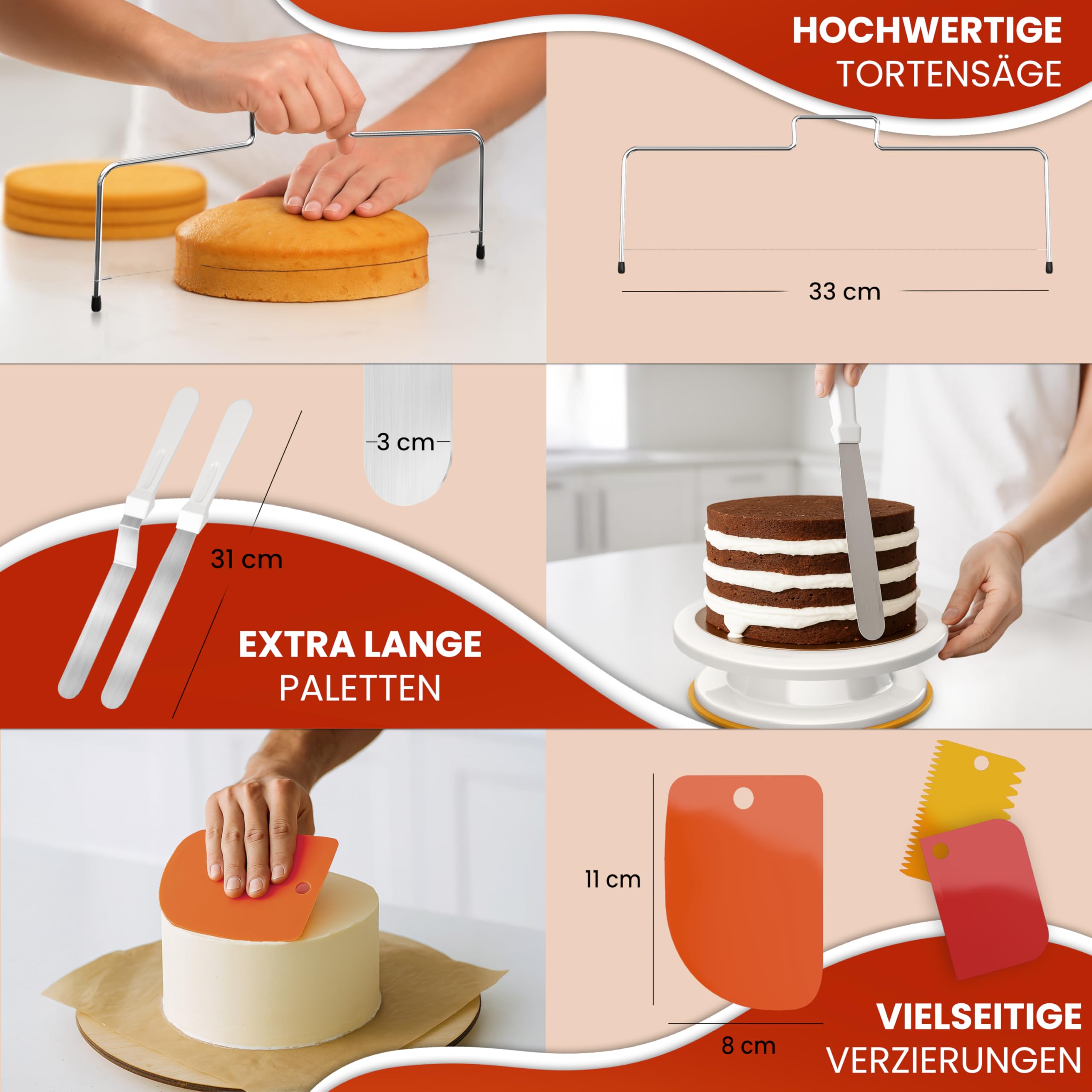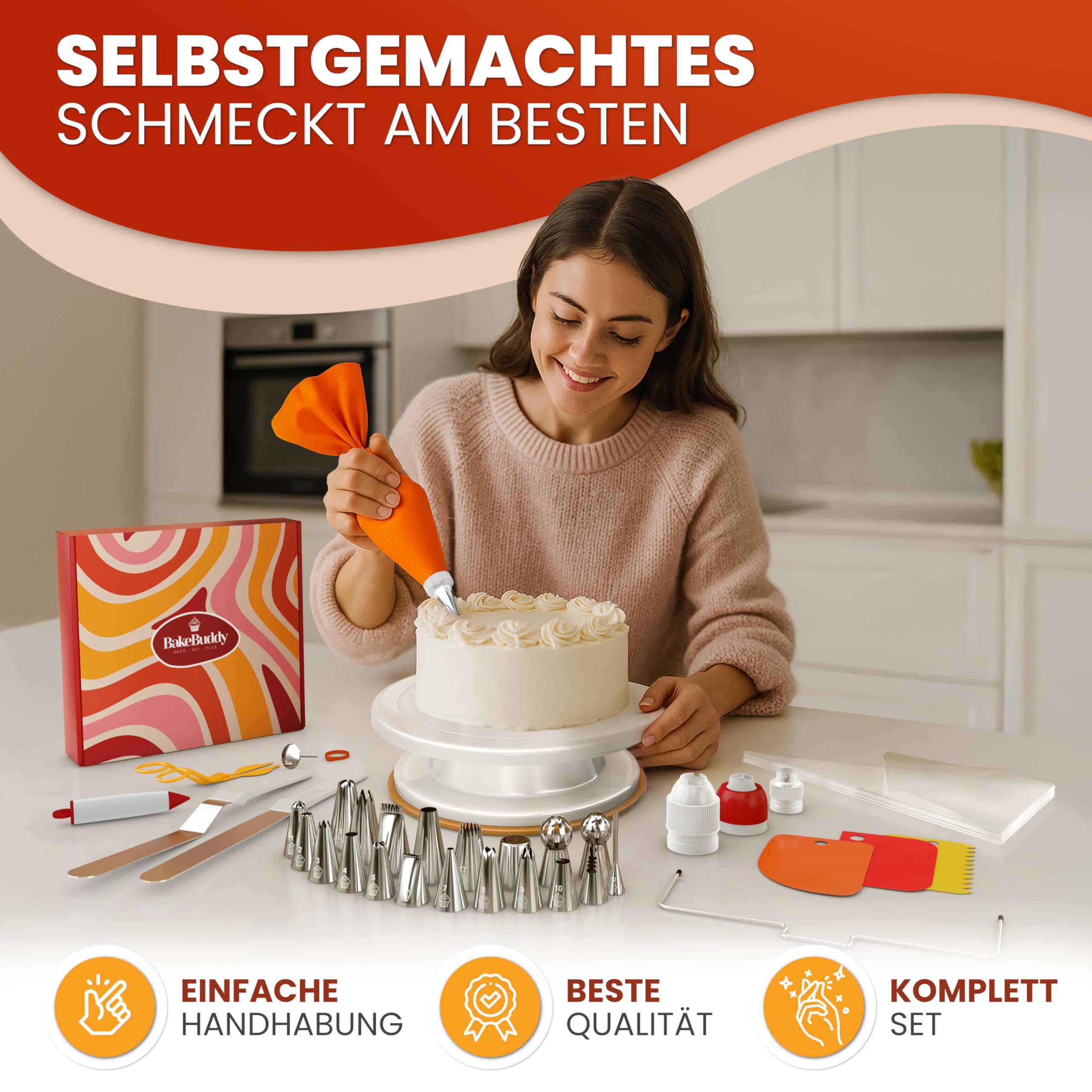 Willst du wie ein Profi backen und deine Torten verzieren? Dieses 61-teilige Torten-Set hat alles, was du brauchst! Die drehbare Tortenplatte mit Anti-Rutsch-Beschichtung bleibt sicher stehen während du arbeitest. Enthalten sind verschiedene Edelstahl-Spritztüllen für die kreativsten Verzierungen - von feinen Mustern bis zum Befüllen von Berlinern und Windbeuteln. Mit den Spritzbeuteln, Teigschabern und Paletten kannst du deiner Kreativität freien Lauf lassen. Alles ist aus robustem Kunststoff, Edelstahl und Silikon - langlebig und leicht zu reinigen. Perfekt für Back-Anfänger und erfahrene Hobbybäcker gleichermaßen. Ein wunderbares Geschenk für alle Backbegeisterten zu Weihnachten, Geburtstagen oder einfach so! Mit diesem Set gelingen dir professionelle Torten, Cupcakes und Gebäck. Tauche ein in die Welt des Backens und werde zum Tortendekorations-Profi!