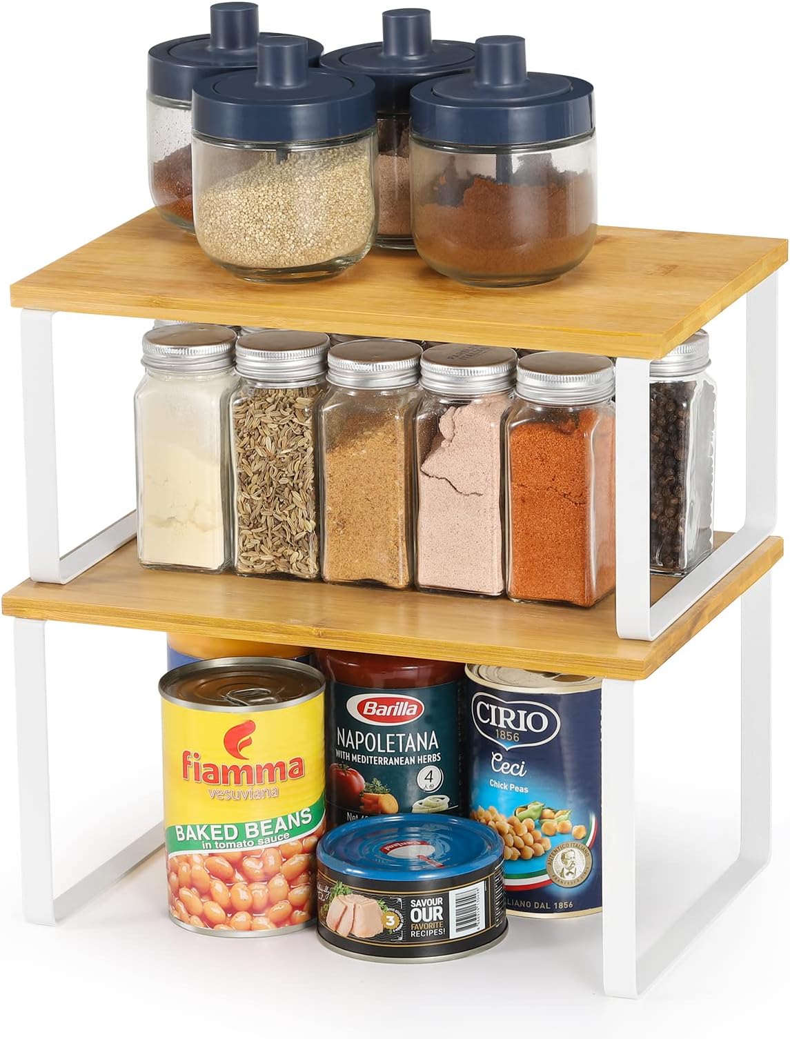 Du kannst sie stapeln, nebeneinander stellen, in L-Form anordnen oder einzeln verwenden - total flexibel! Jedes Regal trägt bis zu 5kg - da kannst du getrost auch schwere Gläser und Dosen reinstellen.