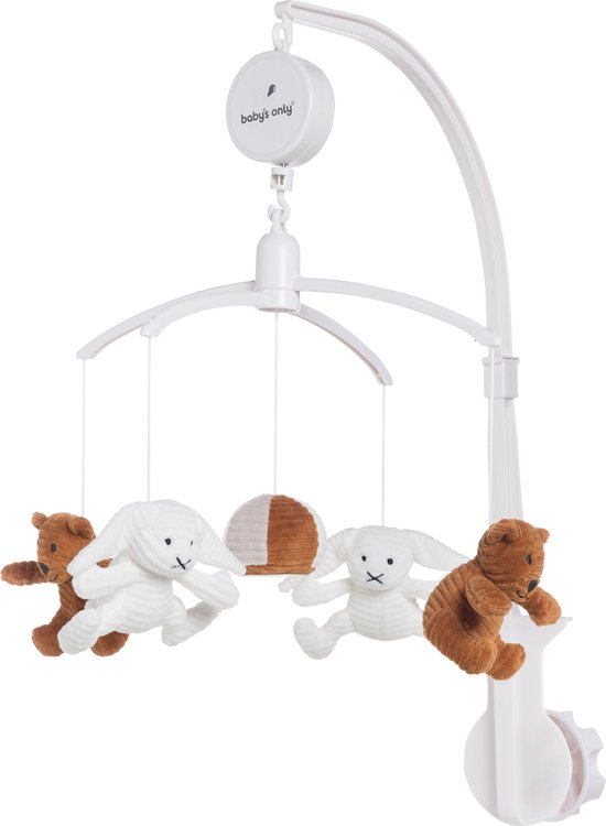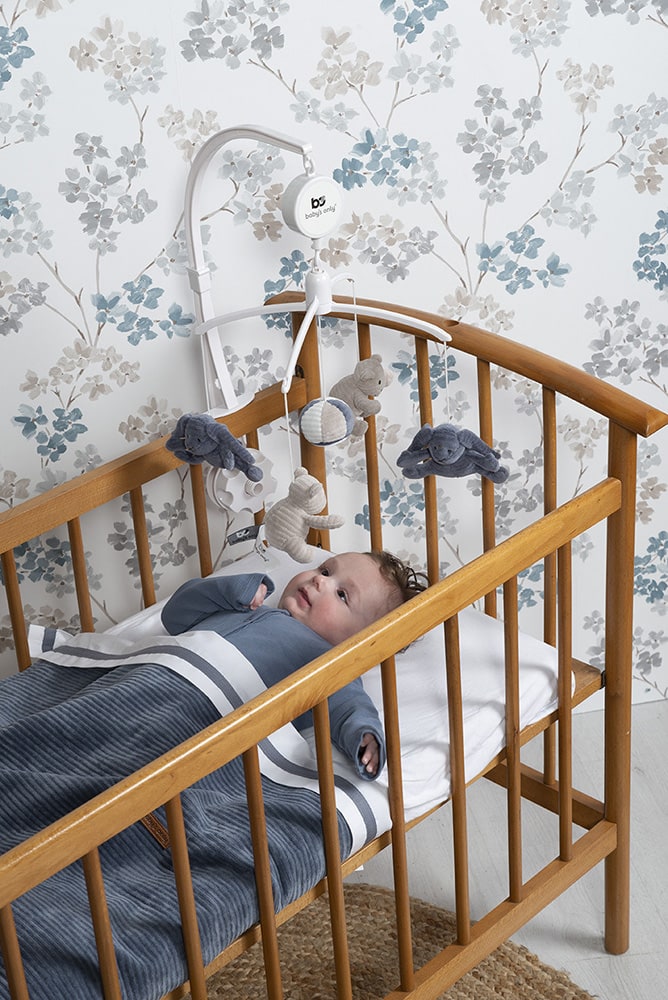 Zauberhafte Einschlafhilfe für dein Baby! Dieses entzückende Sense Musik Mobile von Baby's Only schwebt sanft über dem Bettchen und spielt die beruhigende Melodie 'It's a small world'. Mit niedlichen Miniatur-Kuscheltieren aus weichem Rib Corduroy - einem Bärchen, einem Kaninchen und einem Ball mit Spiegel in der Mitte. Die vintage Blau/Kieselgrau/Weiß-Farbkombination passt perfekt zur gesamten Sense-Kollektion. Einfach am Bett oder Laufgitter befestigen und dein Baby kann den sanft drehenden Tierchen und der beruhigenden Musik lauschen. Wichtiger Sicherheitshinweis: Sobald dein Kind anfängt zu krabbeln oder sich hochzuziehen, solltest du das Mobile entfernen, um Erstickungsgefahr zu vermeiden. Auch sollte es so angebracht werden, dass das Baby es nicht erreichen kann. Die perfekte Ergänzung für das Babyzimmer und eine wunderbare Hilfe für entspannte Einschlafmomente. Schafft eine gemütliche Atmosphäre und fördert die visuelle und auditive Wahrnehmung deines Kleinen.