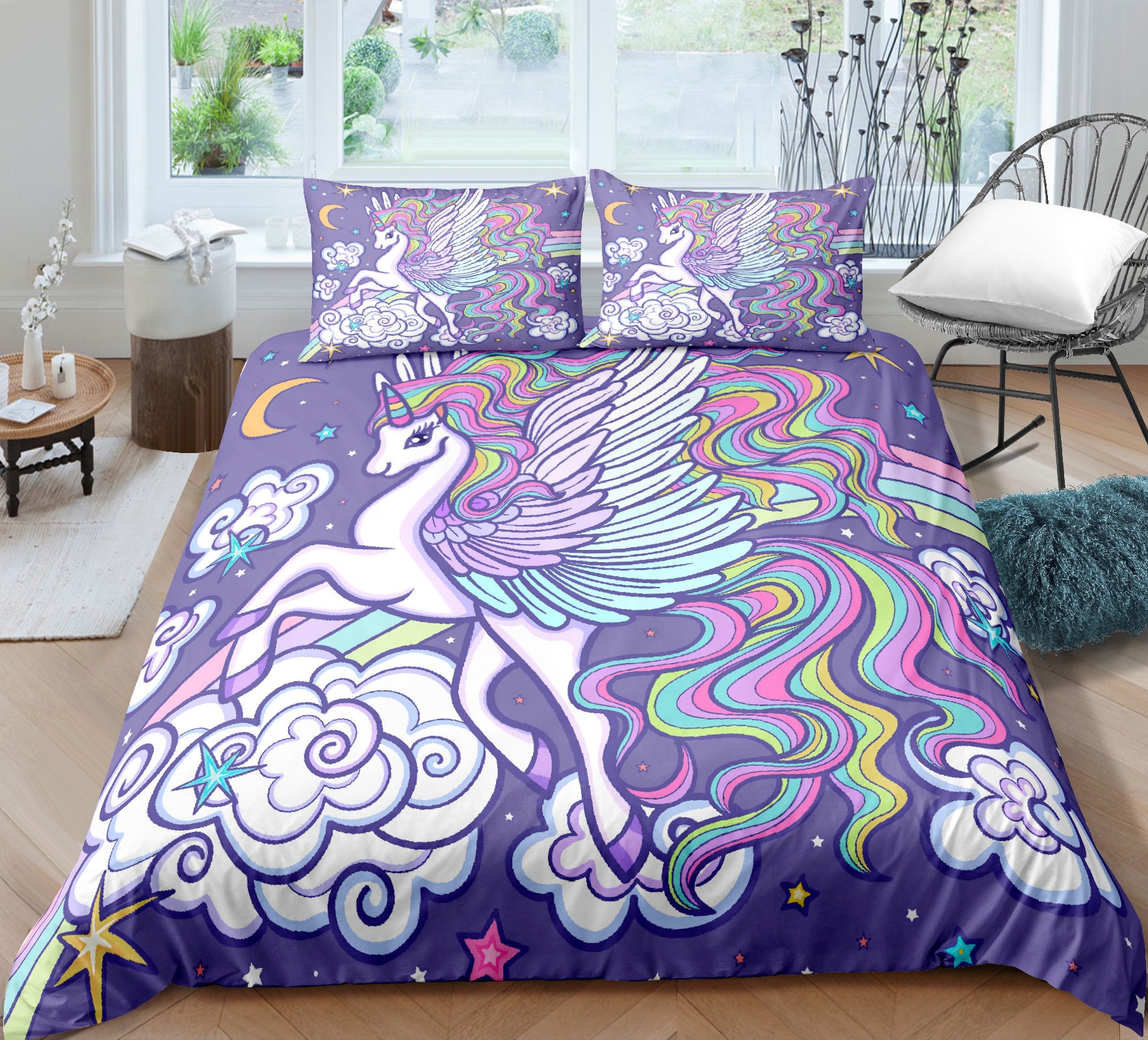 Dieses Einhorn-Bettwäsche-Set ist der absolute Traum für kleine Prinzessinnen! Vorne bezaubernde Einhörner, Schlösser und Regenbögen, hinten dezente Sternenlinien in Lila - einfach wenden für Abwechslung. Aus weicher Polyester-Baumwoll-Mischung, super kuschelig und atmungsaktiv. Mit praktischem Knopfverschluss. Maße: Bettbezug 137x198 cm, Kissenbezug 48x74 cm. Maschinenwaschbar bei 40°C - perfekt für den Alltag. Dein Kind wird sich riesig freuen und garantiert besser einschlafen!